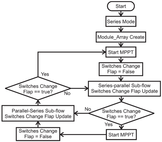 When a parallel connection is formed, the switches change flap is changed to true, and after all modules in the module array that have a voltage lower than have the parallel connections formed, the switches change flap will tell the main thread whether to perform another MPPT operation to go directly to the parallel to series sub-flow.