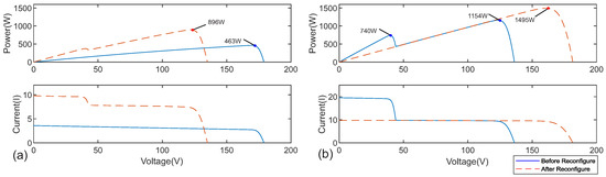 Figure 8b shows the PV and IV curve on these conditions before and after the reconfigures. Before the reconfiguration, the global maximum extractable power under this configuration is 1161 W, corresponding to 77% efficiency. And after the reconfiguration, the new GMPP occurs at 1498 W, achieving 100% of the panel string’s summed individual MPPs and demonstrating full recovery of the original power capacity.