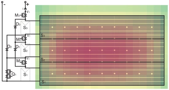 As an example, let us consider the connection between PV module and . Normally, the MOSFET and are both turned on. When the PV module and are both normally working, both diodes and will be inverted and can be regarded as disconnected switches. As a result, the PV module is connected in series to and the current flows from positive terminal thought to negative terminal as shows in Figure 3 with the red arrow.