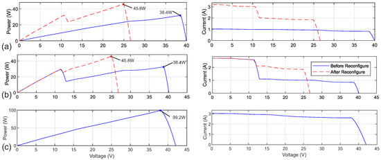 Two experimental scenarios were evaluated to demonstrate the effectiveness of the proposed reconfiguration method. In both cases, the initial and reconfigured P-V and I-V characteristics are shown in Figure 11a,b, while the typical non-shaded P-V and I-V characteristics are illustrated in Figure 11c.