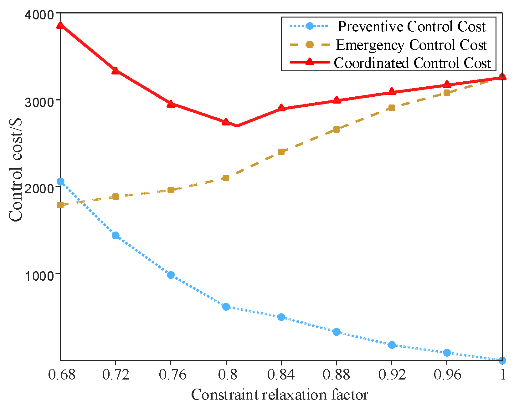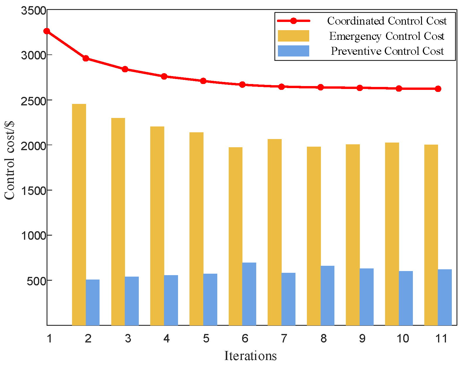 - The coordinated optimal control strategy proposed in this paper for key transmission sections can effectively achieve the optimal coordinated control of prevention control and emergency control, reduce the total coordinated control cost of the system, and significantly improve the system’s safety.