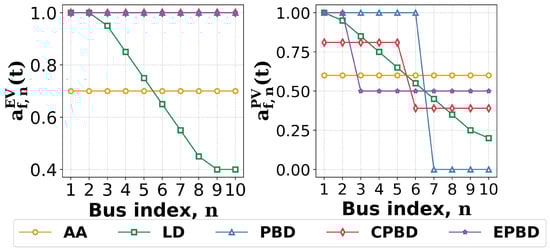 In Figure 2, the individual per-bus actions derived from the proposed disaggregators are depicted and compared using a toy example. Consider a single-feeder network consisting of 10 buses, where the PV generation is equal to 20 kW and the EV demand is equal to 10 kW for each bus. BESSs are not included in this example. The AA suggests the uniform actions and , and these actions are applied to all buses. The LD controller, the slope of which is set to in this example, suggests actions that decrease linearly with the distance from PCC and curtails both PVs and EVs at each bus. Contrarily, the remaining disaggregators penalize only PV generation as it exceeds the EV demand without curtailment. PBD curtails all PV generation for buses 7–10 (the farthest ones from the PCC) and allows the total PV generation from the remaining buses. On the contrary, CPBD with parameter set to suggests the minimum acceptable action of for the last five buses (6–10) and the maximum one, which is equal to , for the remaining ones. Lastly, the EPBD sets the curtailment multiplier equal to for the buses with index and all other multipliers to 1. Thus, for buses with , the allowed PV generation is equal to their local EV demand, setting their export to the grid to zero. Buses 1 and 2 remain unaffected as the condition (18) is fulfilled already without curtailing PV from them.