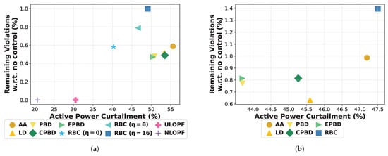 Figure 3a depicts the performance metrics, i.e., the APC percentage, and the remaining violations for the AA, the two-step solution including the different disaggregators and the OPF solutions. All disaggregators present improved performance compared to the AA agent in terms of APC. For RBC, this comes at the expense of a slight increase in violations count. This comparison unveils the benefits of the tailored per-bus curtailments compared to the uniform per-feeder decisions. All disaggregators mitigate or more violations compared to the uncontrolled case that corresponds to fewer than violations per time step observed on average. The lowest number of violations is achieved by EPBD, while RBC achieves the lowest APC percentages. Especially, when the parameter is set equal to 0, i.e., no upstream buses are affected, RBC achieves an APC percentage equal to , which is much lower than the one of the second-best-performing disaggregator, i.e., for EPBD. PBD has similar performance to EPBD. CPBD and LD exhibit equivalent performance, which is better than AA, but not as good as PBD and EPBD.
