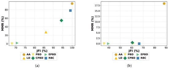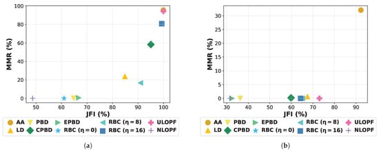 Regarding the fairness metrics, which are illustrated in Figure 9, the relative ordering of controllers remains unchanged as in Figure 4. The AA maintains its performance in terms of JFI, but with BESSs, it achieves a lower MMR value than without BESSs. This observation can be explained by the formula of MMR in Equation (30). In more detail, focusing on a single-feeder, the denominator of the MMR metric is equal to ; thus, an increase in the mininum utilization value implies a decrease in the denominator of the MMR metric. Similarly, the numerator is given by . If we denote by the absolute increase in , the absolute increase in , and the initial MMR ratio, the derived MMR value is lower if the relation holds as can be proven by trivial calculations. Considering the uniform actions of AA and the reduced curtailment needs, the values of and are expected to be similar and positive, but is lower or equal to 1; hence, the drop of MMR value is justified. Furthermore, RBC and CPBD are again the most fair disaggregators, even though the corresponding JFI and MMR fairness metric values have slightly dropped compared to the case without BESSs. Worth mentioning are the improvements noticed in the fairness metrics for PVs of the PBD and EPBD controllers and in the JFI metric for EVs of EPBD and RBC.