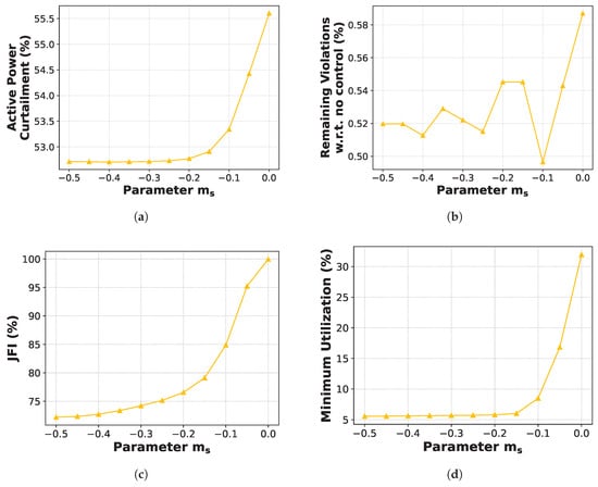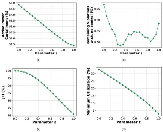 Sensitivity of the CPBD-obtained metric values with respect to the parameter . (a) Active Power Curtailment. (b) Remaining violations. (c) JFI of PVs. (d) Minimum PV utilization.