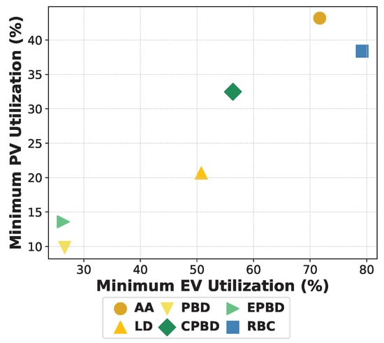 Minimum utilization metric for all controllers after the adoption of BESSs: x-axis is the minimum EV utilization and y-axis the minimum PV utilization.