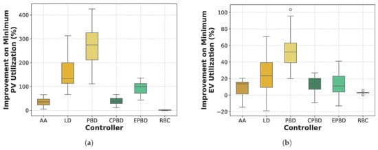 Improvement in the minimum utilization metric due to the integration of BESSs. (a) Minimum PV utilization. (b) Minimum EV utilization.