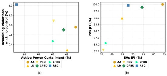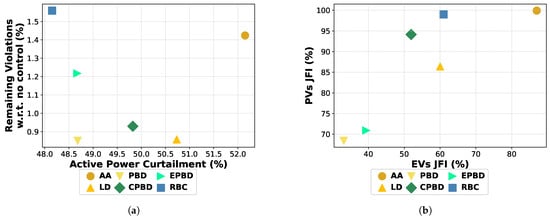 Fairness evaluation of the controllers in the absence of BESSs. (a) PV curtailment. (b) EV curtailment.