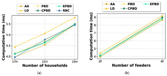 Finally, we assess the scalability of the controllers in terms of action inference time during deployment. Figure 14 presents the average calculation time per time step for varying number of households and feeders. In all cases, the controllers achieve inference times below 9 ms, demonstrating their applicability for real-time control applications. Note that the reported times correspond to a setup where the AA is executed centrally, followed by parallel disaggregation calculations per feeder, except for the RBC where the centralized BESS action inference runs in parallel with the RBC-based PV and EV curtailment computations. The highest computation time is observed for the LD disaggregator. However, this can be significantly reduced by implementing an alternative approach, in which each bus performs the disaggregation locally, considering its index within the feeder is known. This modification would yield computation times similar to those of the AA controller.