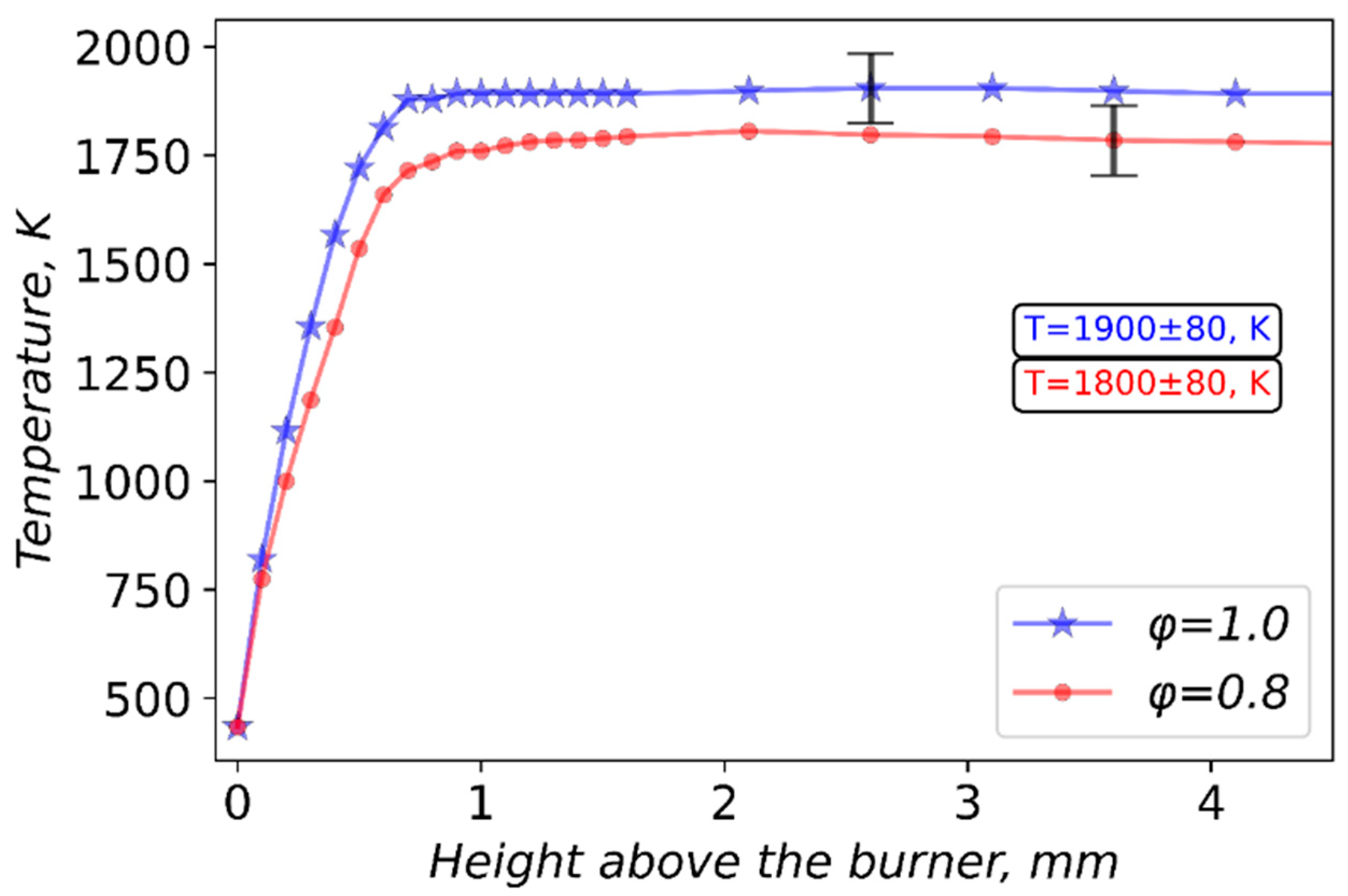 - Dmitriev, A.M.; Agafontsev, M.V.; Loboda, E.L.; Knyazkov, D.A.; Korobeinichev, O.P. Measuring the Surface Temperature of a Molecular Beam Probe in the Flame Front at Pressures of 1–5 Atm. Combust. Explos. Shock. Waves 2019, 55, 555–561. [Google Scholar] [CrossRef]