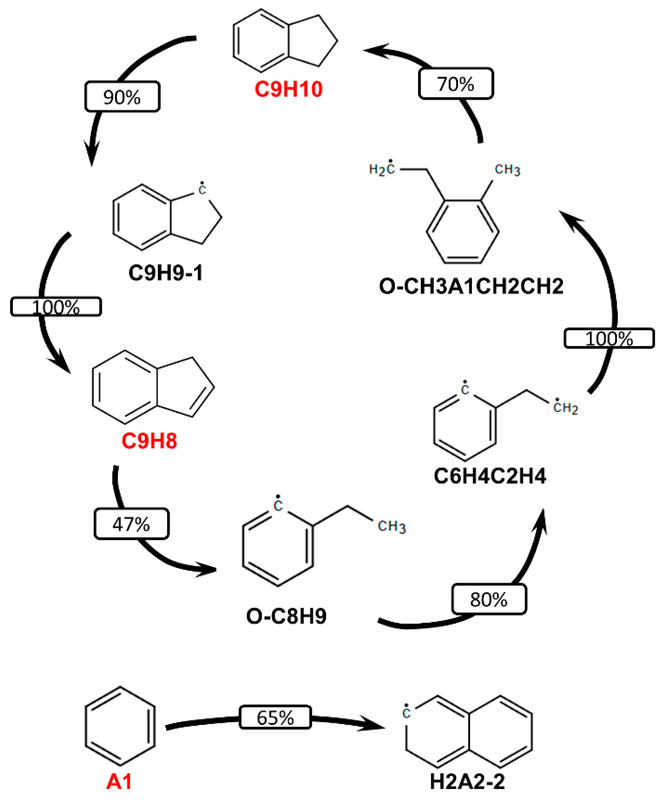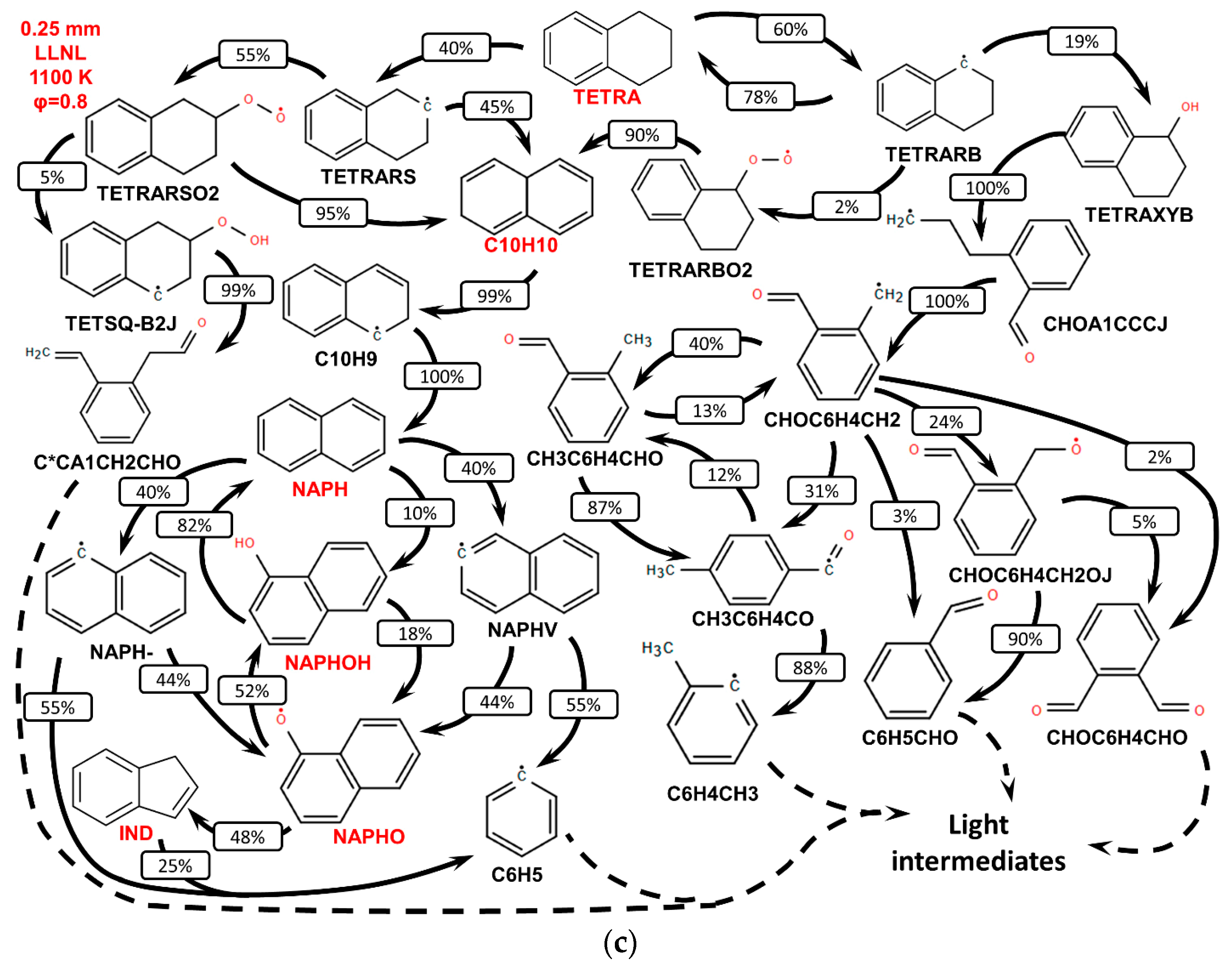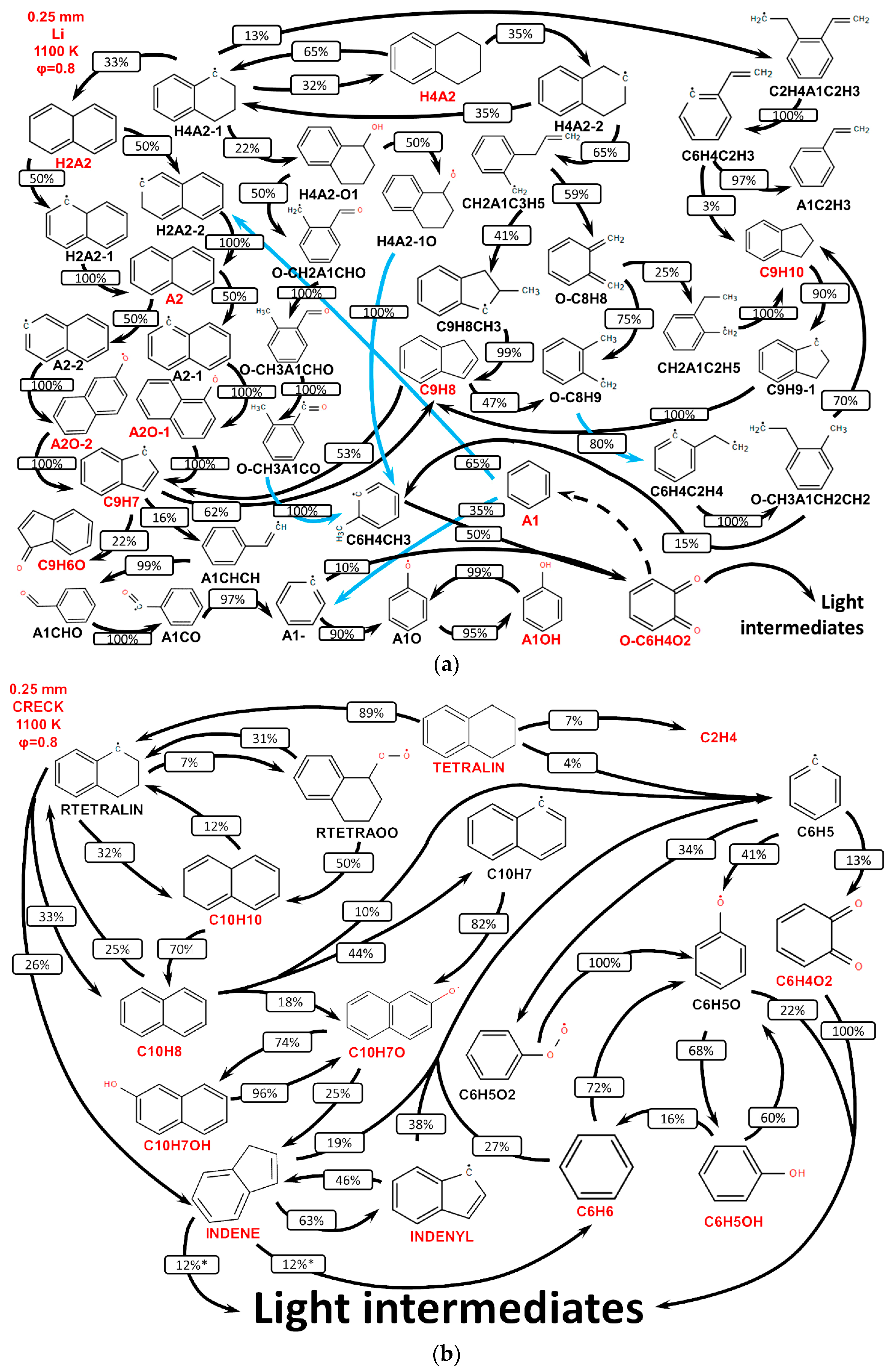 - The primary decomposition kinetics of tetralin under flame conditions (i.e., those leading to C10 intermediates versus ring-opening reactions) remain poorly understood. These inconsistencies result in different ratios of heavy cyclic hydrocarbons to light hydrocarbon components within the reaction networks. The kinetic parameters of the corresponding pathways should be refined to ensure their accuracy across the full range of temperature conditions, including flames.