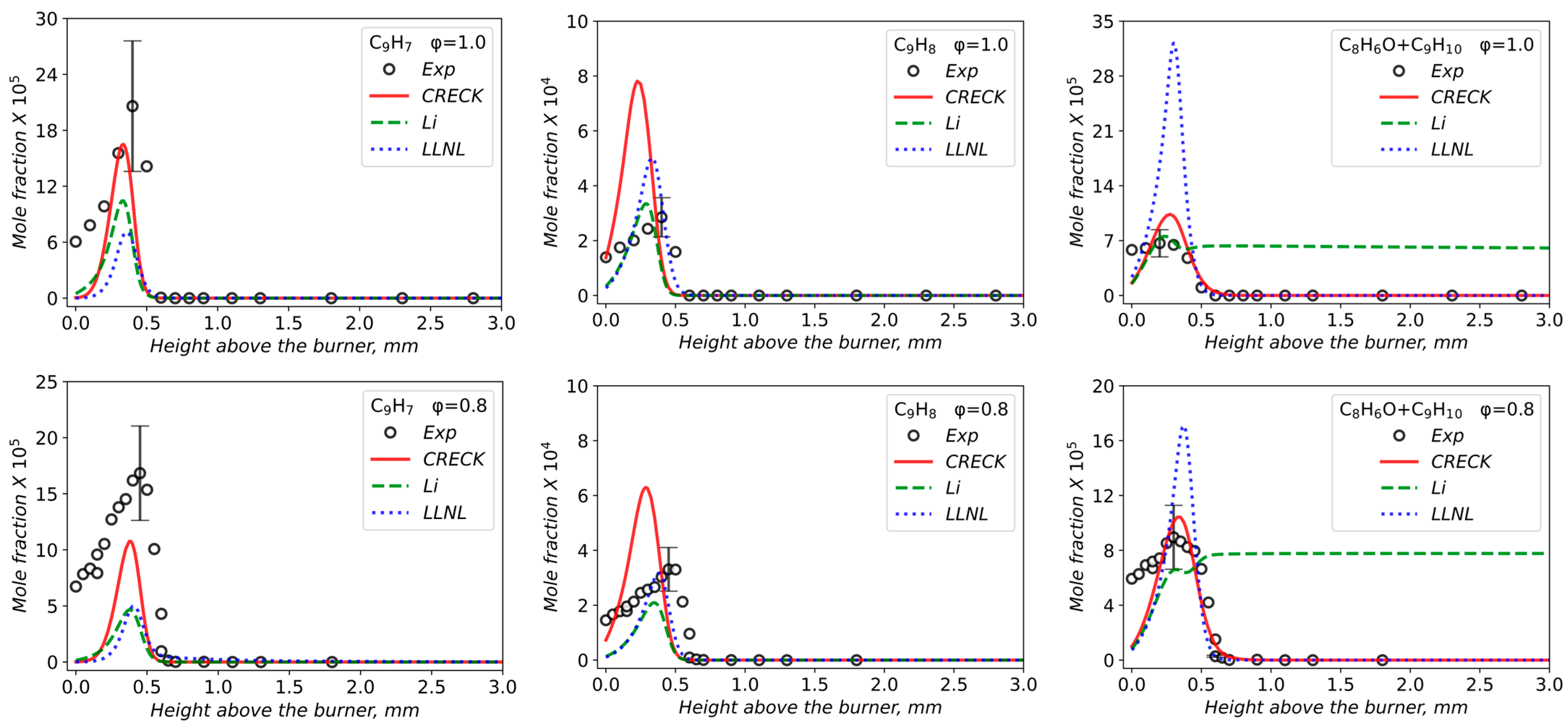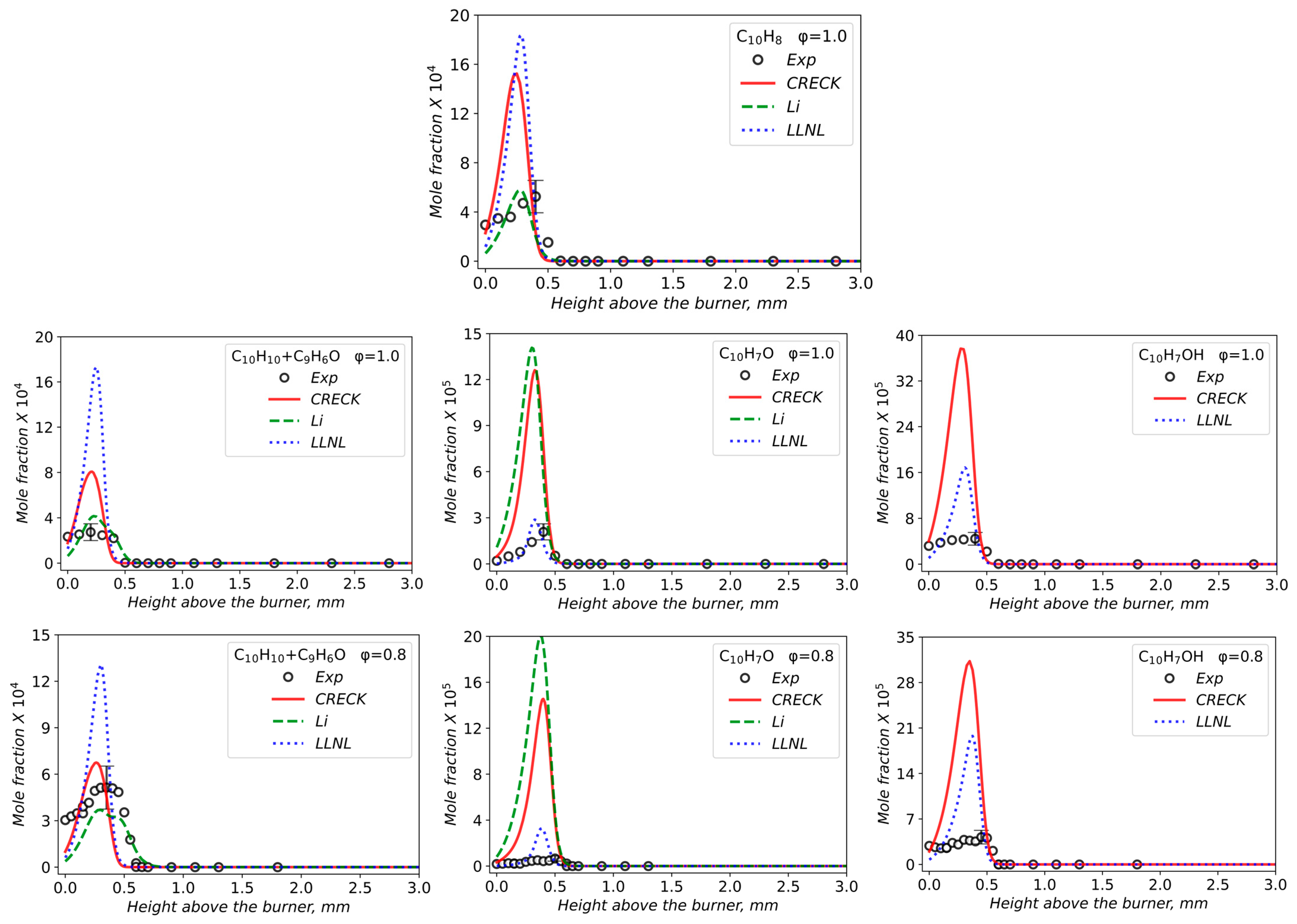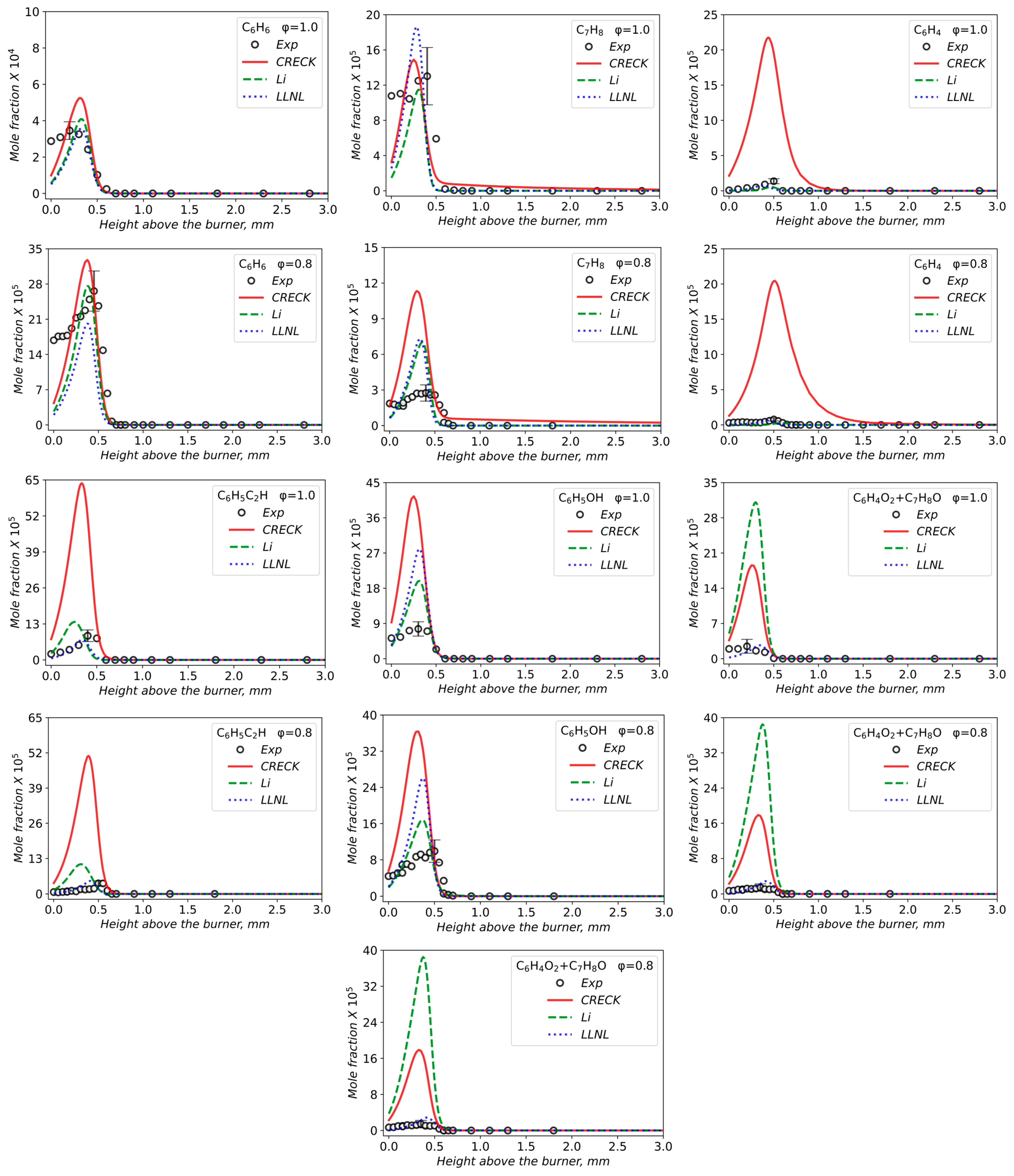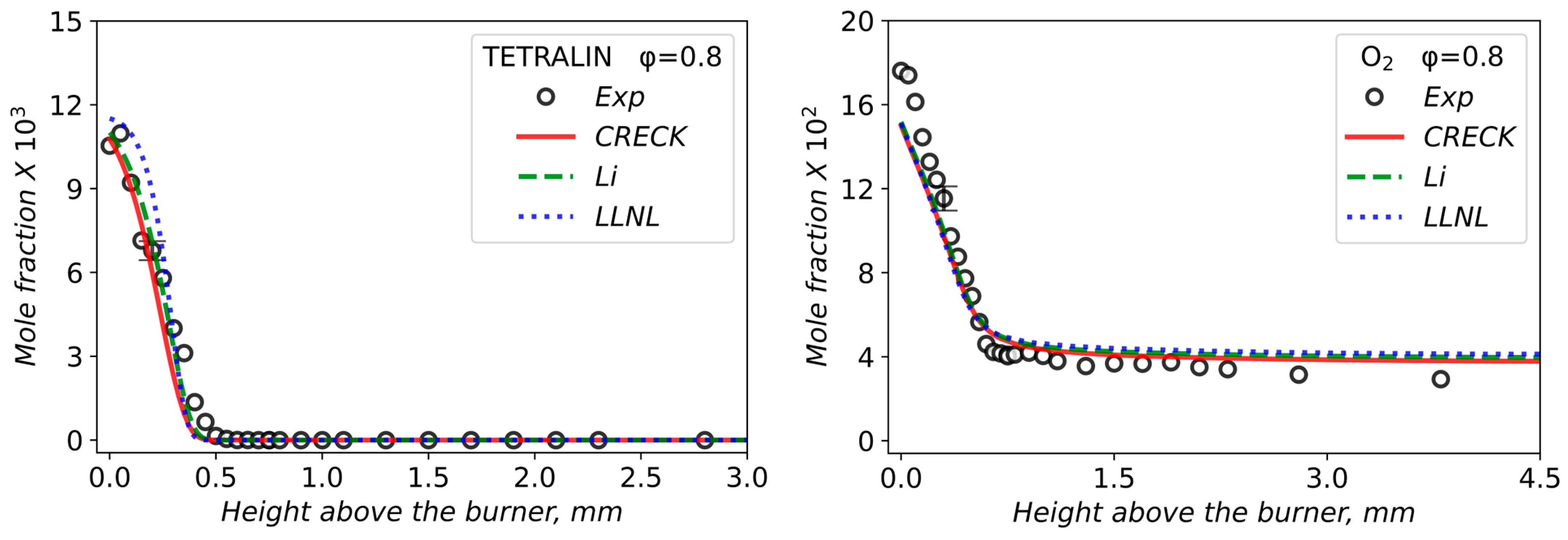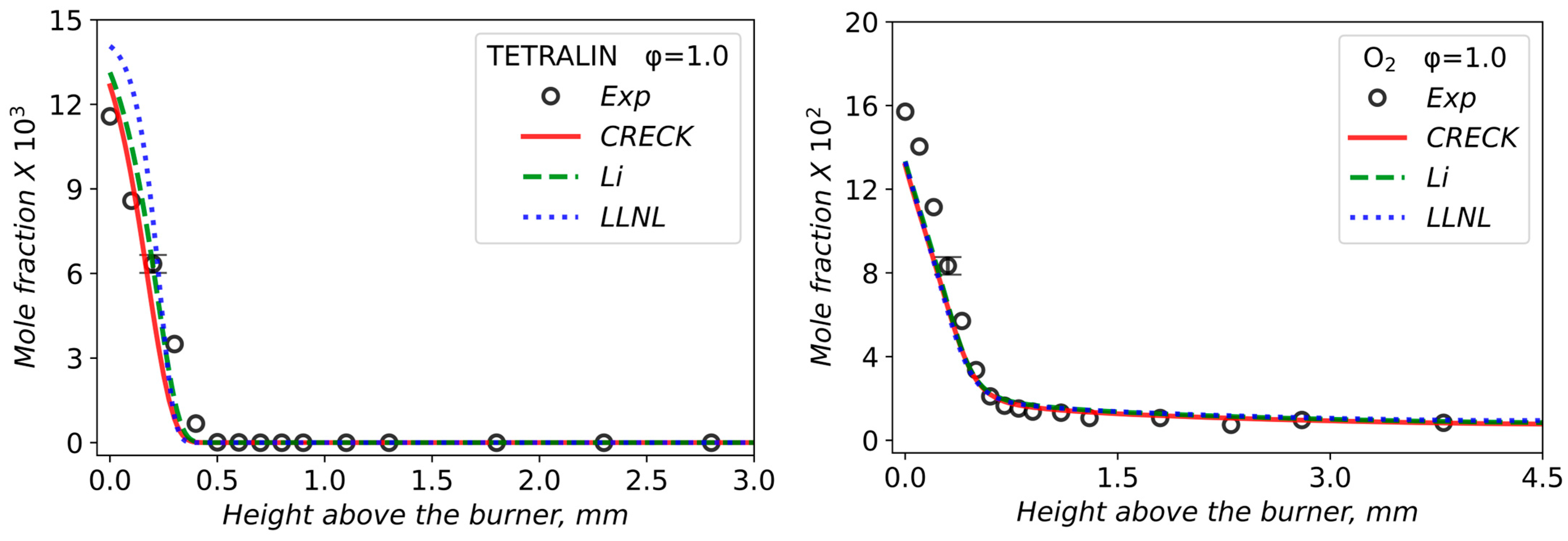 - Matyushkov, V.V.; Chernov, A.A.; Dmitriev, A.M.; Shmakov, A.G. Chemical Structure of Lean and Stoichiometric Laminar Flames of Methylcyclohexane at Atmospheric Pressure. Energies 2024, 17, 6154. [Google Scholar] [CrossRef]