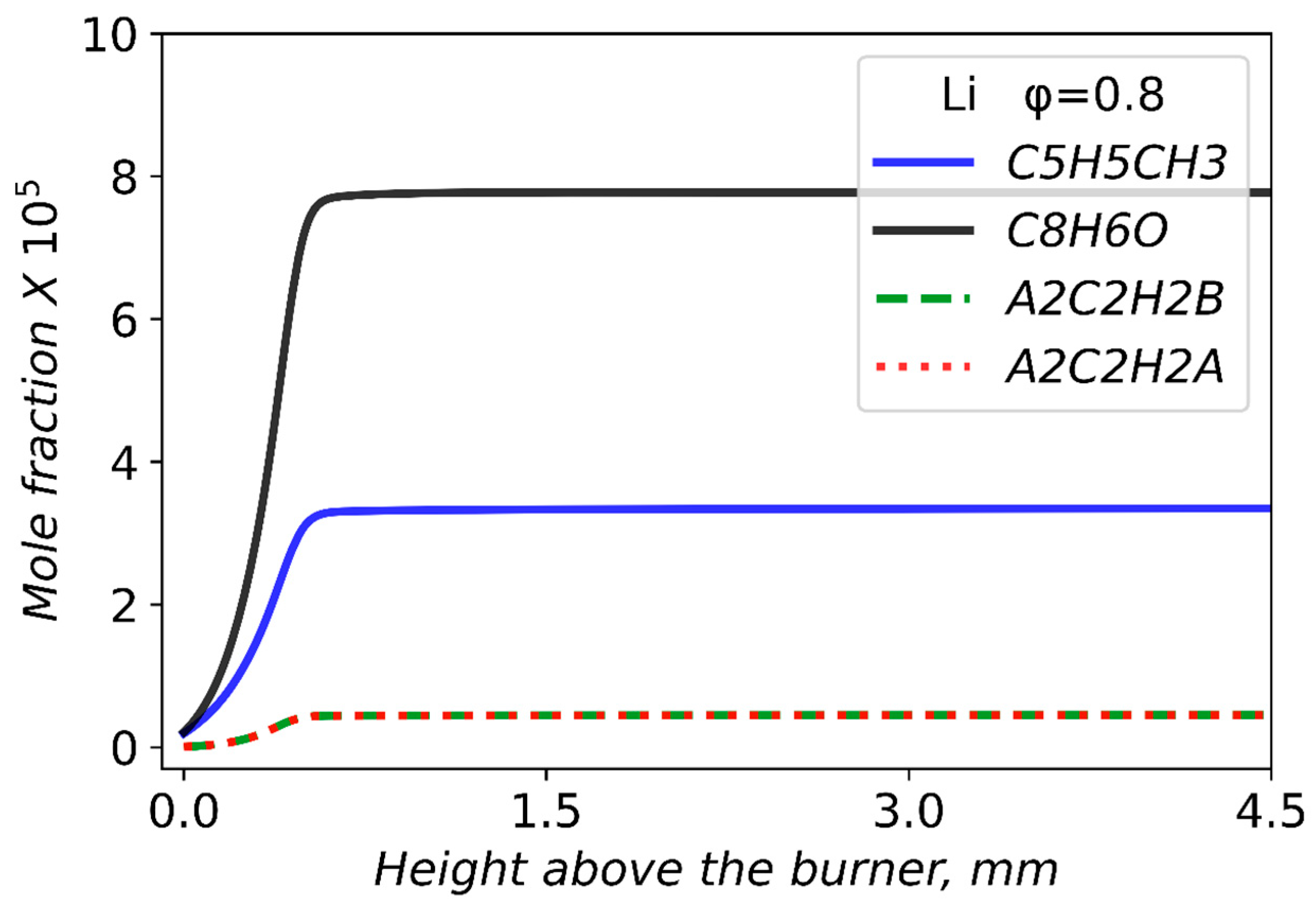 - Dmitriev, A.M.; Knyazkov, D.A.; Bolshova, T.A.; Shmakov, A.G.; Korobeinichev, O.P. The Effect of Methyl Pentanoate Addition on the Structure of Premixed Fuel-Rich n-Heptane/Toluene Flame at Atmospheric Pressure. Combust. Flame 2015, 162, 1964–1975. [Google Scholar] [CrossRef]