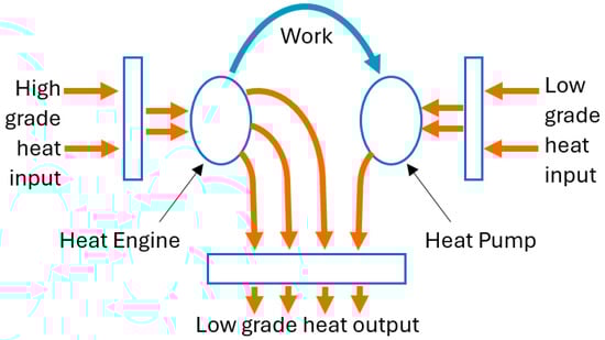 Figure 1 shows how an HP3 achieves its heat multiplication effect. When a heat engine section takes in 1 unit of high-grade heat, it produces units of mechanical work and delivers units of low-grade heat into a house. The units of work drive the heat-pump, which draws in units of heat from the ambient and delivers a total of units of low-grade heat into the house. Here, is a design variable and represents the heat pumps’ performance coefficient (CoP). Typical CoP values are between 1 and 4. The difference with a ‘normal’ heat pump is that the input energy is heat and not electricity.