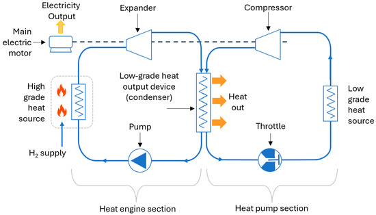 In the heat engine section, the work fluid can reach temperatures of approximately 650 °C after collecting high-grade heat from the combustion of hydrogen (or another clean fuel). Although this may seem high for a domestic system, current natural gas boilers see temperatures in excess of 1000 °C inside the combustion chamber [39,40]. The difference is that in a gas boiler, hot water is produced directly, and its temperature is not allowed to exceed ~70 °C. In an HP3 system, the working fluid is allowed to reach much higher temperatures, but the hot water output will still be under the safe limit. Therefore, implementing an HP3 system in a domestic setting is feasible. It should be noted that HP3 systems could also be implemented at a larger scale (e.g., district heat networks [41,42]) where a central multi-MW system can combust hydrogen, produce hot water and deliver it to several dwellings.