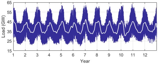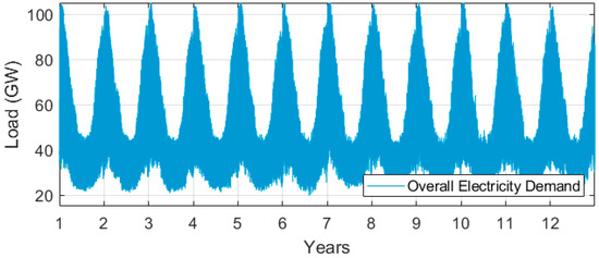 Figure 3 shows a 12-year time series of UK electricity demand sourced from the ‘Balancing Mechanism Reporting Service’ [44]. The resolution of the data is 1 h. The time series is normalized and adjusted so that the mean yearly demand matches current consumption (~335 TWh) [45]. The grid sees a mean load of approximately 35 GW, peaking at around 60 GW. The 12 years of demand data cover some extreme weather conditions in the UK, such as the ‘Beast from the East’ event in 2018. However, in this paper, we avoid making predictions of future changes in demand due to varying weather conditions.