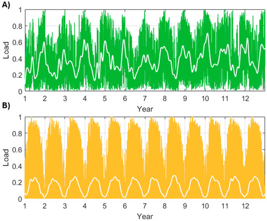 Figure 4A shows a 12-year time series of wind power in the UK [44,46]. The profile is normalized to account for an expansion in the installed capacity. Wind has large daily, seasonal and inter-annual variations [44,47,48]. Figure 4B shows a time series of solar photovoltaic power generation in the UK [49]. Solar PV shows a more marked seasonal variation compared to wind.