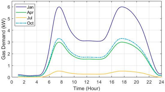 Data relating to the residential gas consumption in the UK was obtained from a 2021 study carried out by the University College London [51]. On average, a dwelling will consume 12.4 MWh of gas per year [52]. The hourly gas demand of a property changes with respect to the month of the year, as Figure 5 shows. There are two main peaks, one around 8:00 and another around 18:00. The heating season (Oct-Apr) sees more pronounced peaks. Figure 5 also shows that overnight demand is low throughout the year.