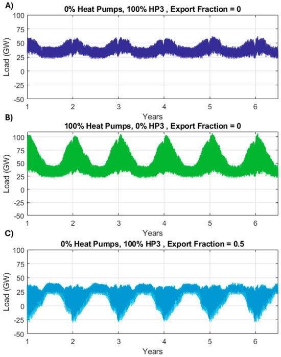 Lastly, Figure 8C shows a scenario where 100% of homes use HP3 systems and these units export 50% of their heat output in the form of electricity (Ɛ = 0.5). We can see that demand becomes negative in this case. This is because demand is ‘low’ because there are no heat pumps, and the fleet of HP3 systems exports a considerable amount of electricity to the grid at times when it is not needed.