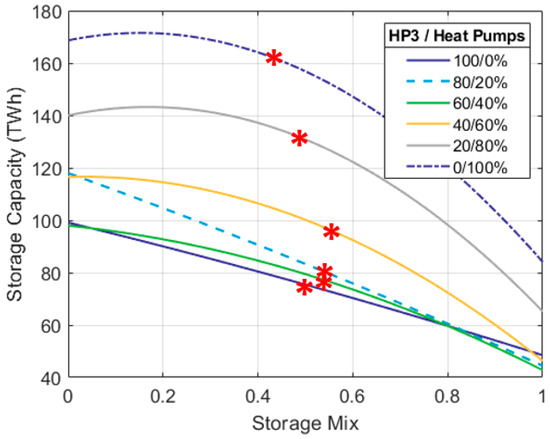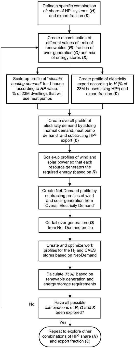 For each combination of H and Ɛ, we need to find the optimum configuration for the electricity system. This allows calculating the energy storage capacity needed and the electricity cost and then assessing whether a greater proportion of HP3 systems or a greater electricity export reaction can offer a benefit at a system level.