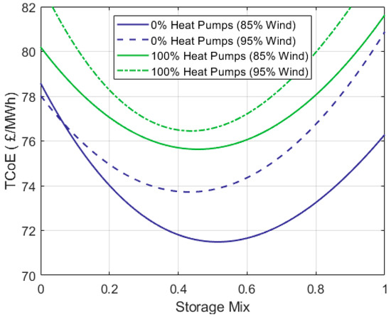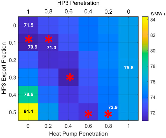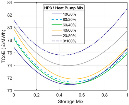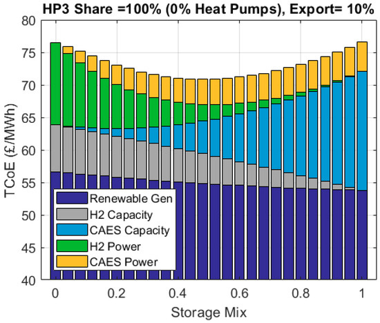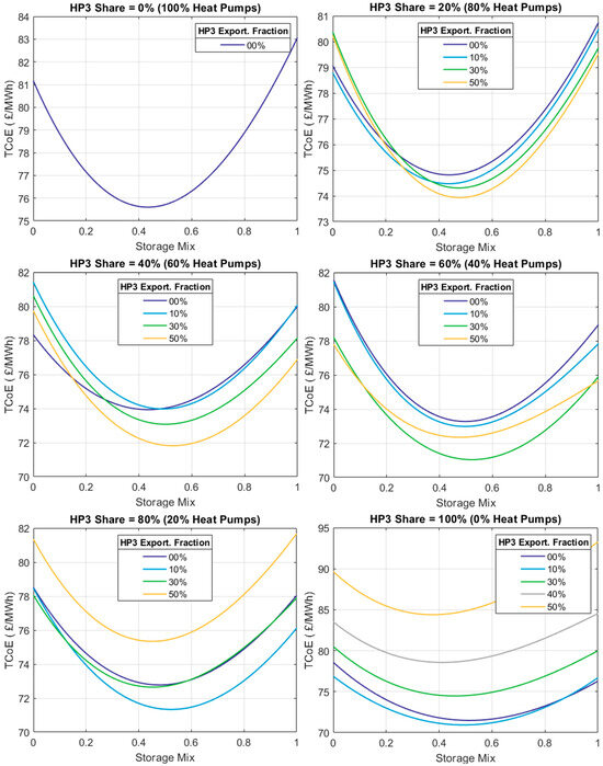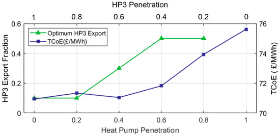 As mentioned, for each combination of H and Ɛ, we must determine the optimum system configuration. This allows for determining the storage capacity needed and the total cost of electricity (GBP/MWh) for every scenario. In turn, this allows for understanding how different HP3 penetration levels and export fractions can help to reduce the TCoE compared to a scenario in which electrical heat pumps wholly meet the demand for space heating.