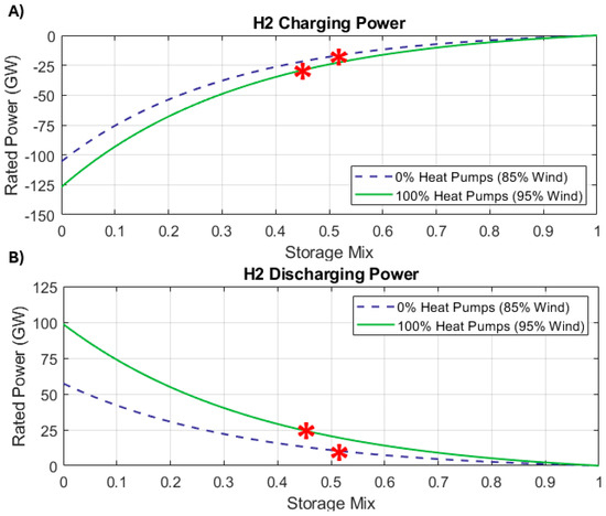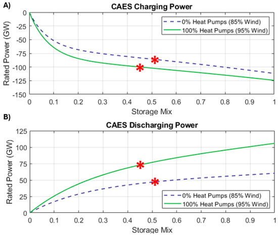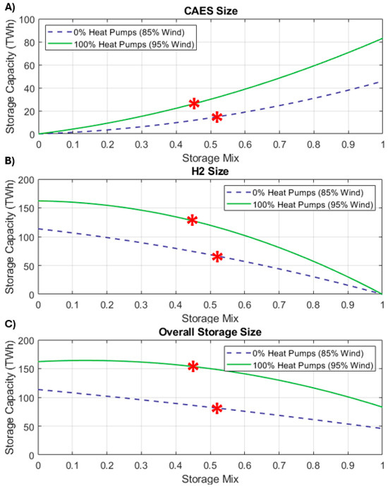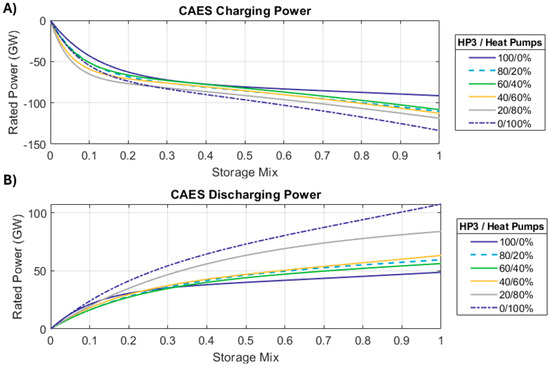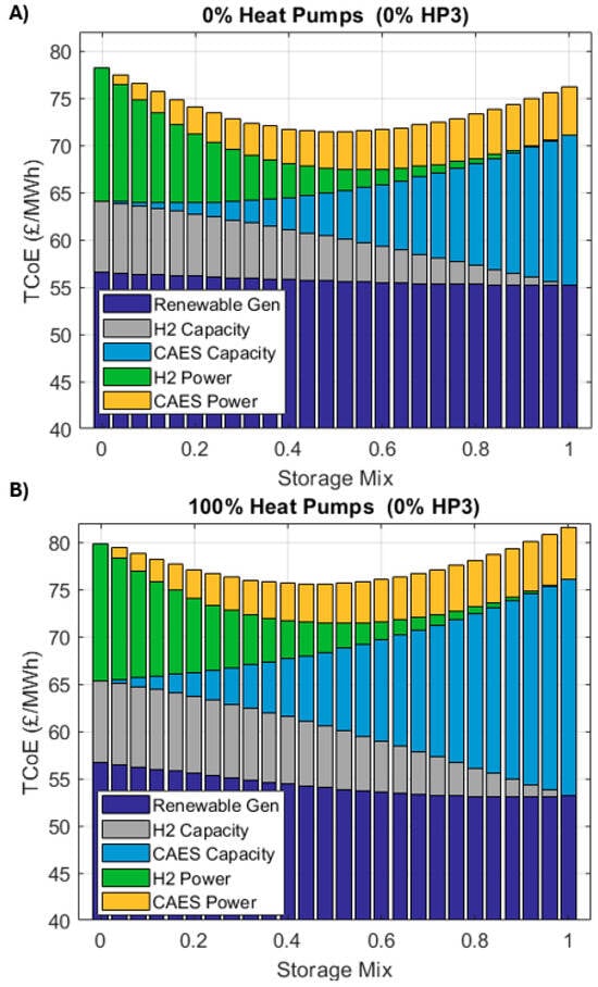 Previous work by the authors indicated that Li-ion batteries will contribute between 0.2 and 0.5 TWh of capacity to the electricity system. By comparison, the combined contribution of medium- and long-duration stores is several tens of TWh [29]. Not including batteries in the analyses does not significantly affect the trends presented further in Section 4.1 and Section 4.2. The main research objective can still be explored, which is whether the deployment of heat-powered heat pumps could reduce the amount of grid-scale energy storage needed. However, once batteries are included in the mix, the total costs per MWh of electricity could increase by ~6 GBP/MWh due to the capacity costs of batteries being much higher than those of underground hydrogen caverns or CAES systems [68,69,70].