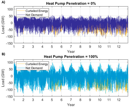 Figure 7 shows the overall electricity demand profile that would be seen in the country if domestic space heating were fully supplied by electrical heat pumps. In this scenario, the mean yearly demand reaches a total of 423 TWh, which is a 26% increase over the current value. Other researchers have reported similar estimates [24,25,26].