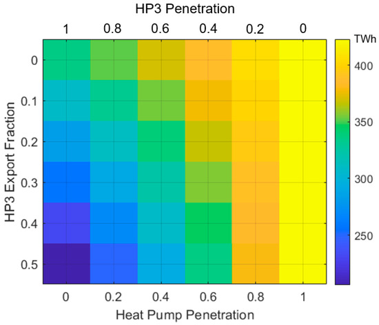 This study analyzes the potential effect, at a system level, of deploying heat-powered heat pumps (HP3 systems) in the country. We carry out a combinatorial exploration based on two variables: the share of households using HP3 systems (H) and the electricity export fraction of those systems (Ɛ). Ɛ is a fraction of the heat output of an HP3 system and varies between 0 and 0.5