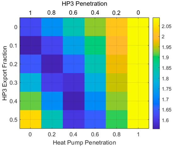 As mentioned, an HP3 system can produce some electricity while operating. This electricity can be exported to the grid or used for self-consumption. The amount of electricity that a system produces is given as a fraction of the thermal output of the unit. An HP3 system has the same thermal output as a heat pump; this is given by the household’s heat demand. The electricity export profile of a property using an HP3 system is simply the profile of heat demand (shown in Figure 6) multiplied by the export fraction (Ɛ). A separate study revealed that export fractions higher than 0.5 significantly reduce the coefficient of performance of an HP3 system. Therefore, in this paper, we fixed the upper limit for Ɛ at 0.5.