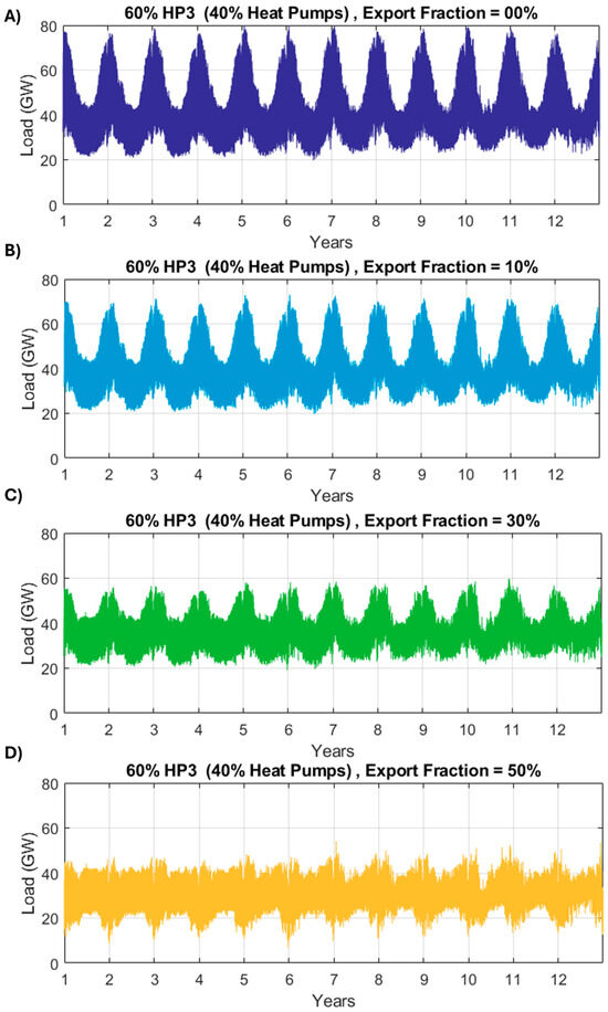 Figure 8 illustrates how different combinations of H and Ɛ modify the overall profile of electricity demand. In Figure 8A, we can see the case where HP3 systems are being used in 100% of homes, but these systems do not export any electricity (Ɛ = 0). In this case, the profile of electricity demand is unmodified and is equivalent to the current situation in which natural gas boilers supply heat demand.