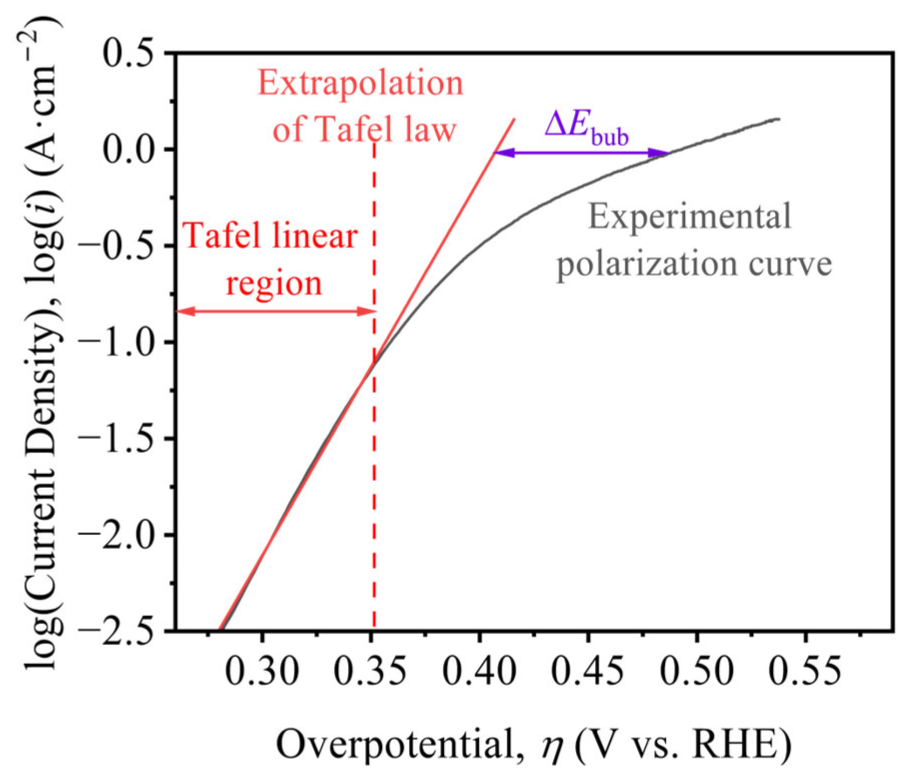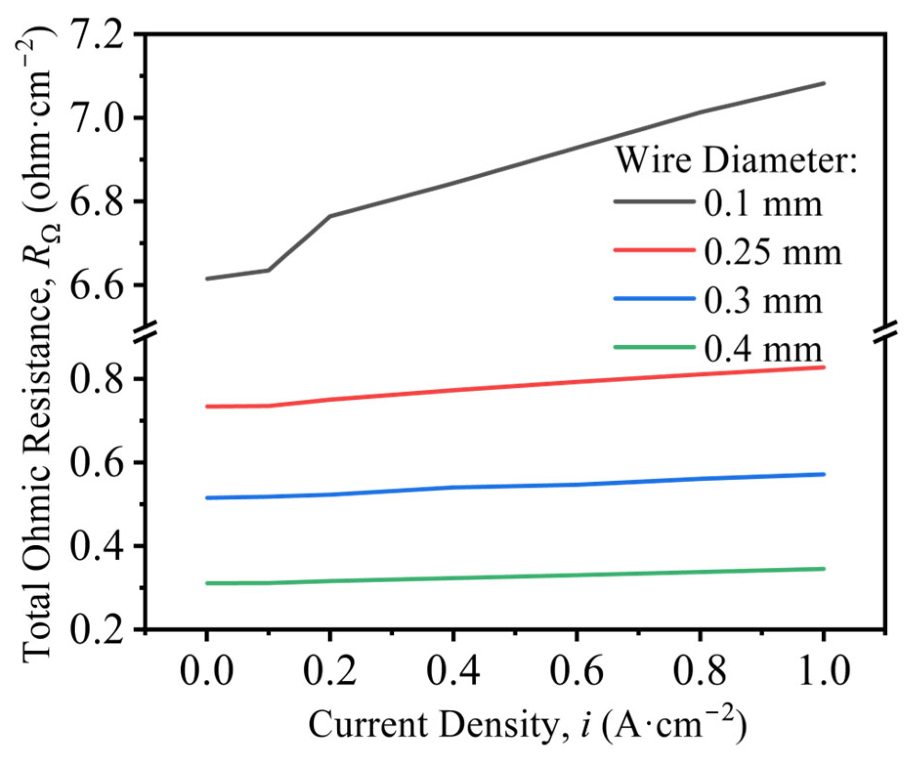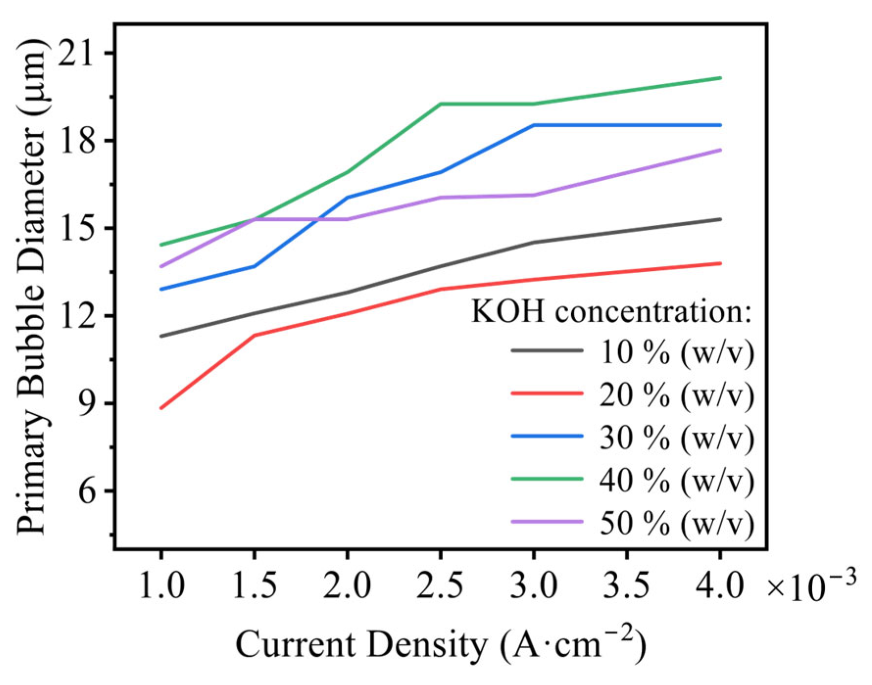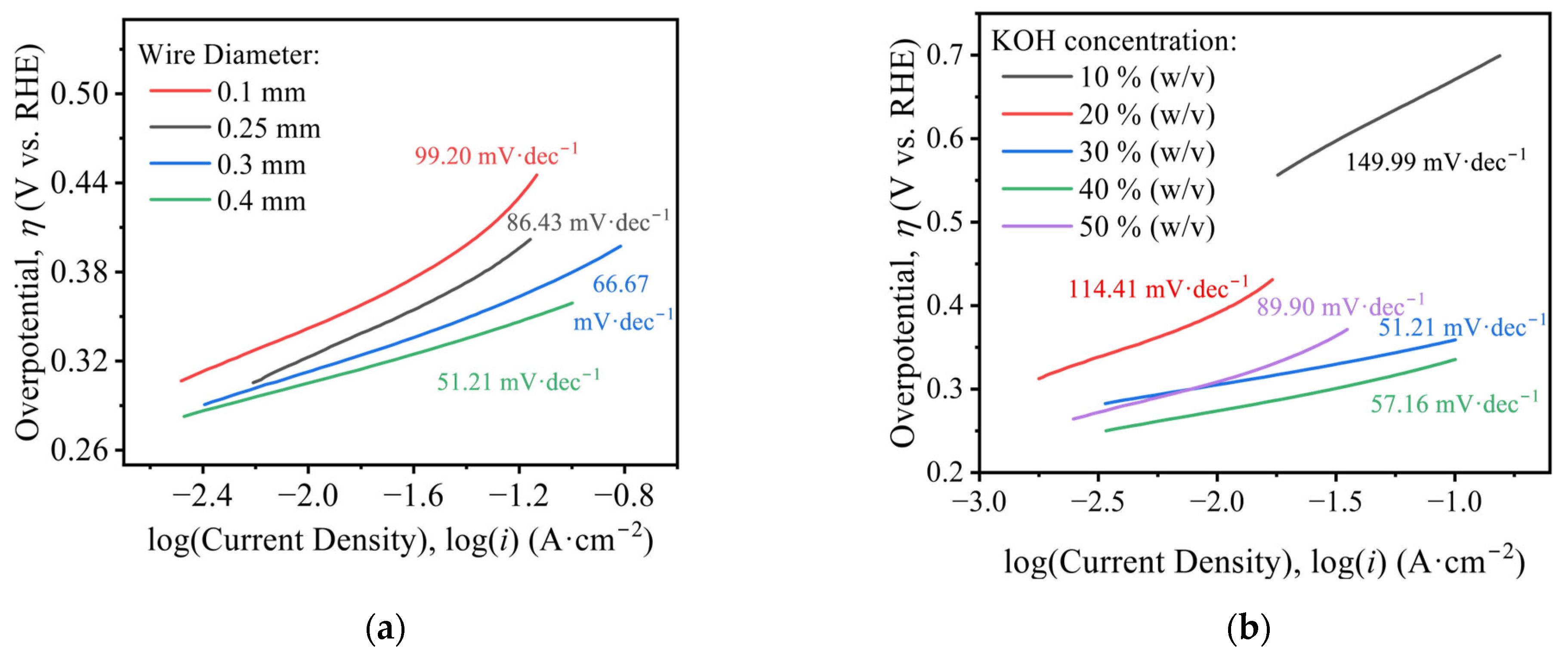 - Larger wire diameters improve OER performance, reflected by lower overpotentials and smaller Tafel slopes. The effect of KOH concentration is non-monotonic: performance is optimal at 30% (w/v) KOH, where both overpotential and Tafel slope reach minimum, consistent with industrial practice. The bubble-induced overpotential, ΔEbub, increases with current density. Electrodes of smaller diameter exhibit higher areal bubble coverage and inferior activation-controlled performance. Dispersed bubbles elevate the solution resistance; correlation analysis demonstrates a linear relationship between total bubble volume and bubble-induced ohmic resistance, Rbub.