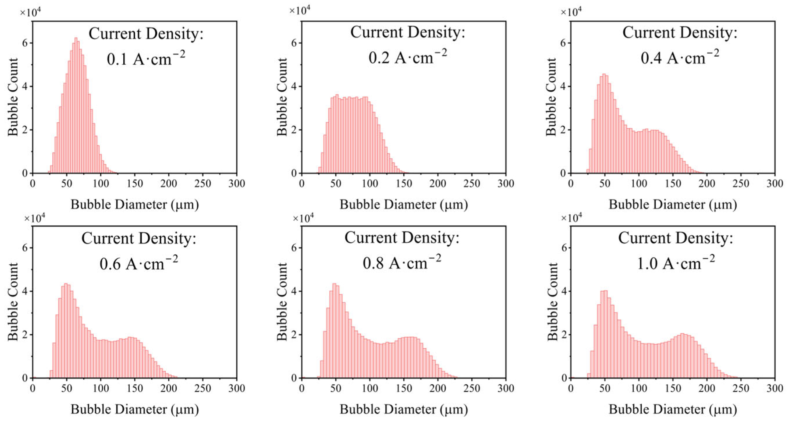 - Bubble evolution modes were classified. Under very low current density (0.001 A·cm−2), isolated bubbles complete growth and detachment independently, and detachment diameter increases with current density. At higher current densities, surface coverage by bubbles increases and bubbles manifest as an attached bubble layer plus free bubble groups: bubbles in the layer grow via diffusion and coalescence, whereas free bubbles grow predominantly via coalescence.