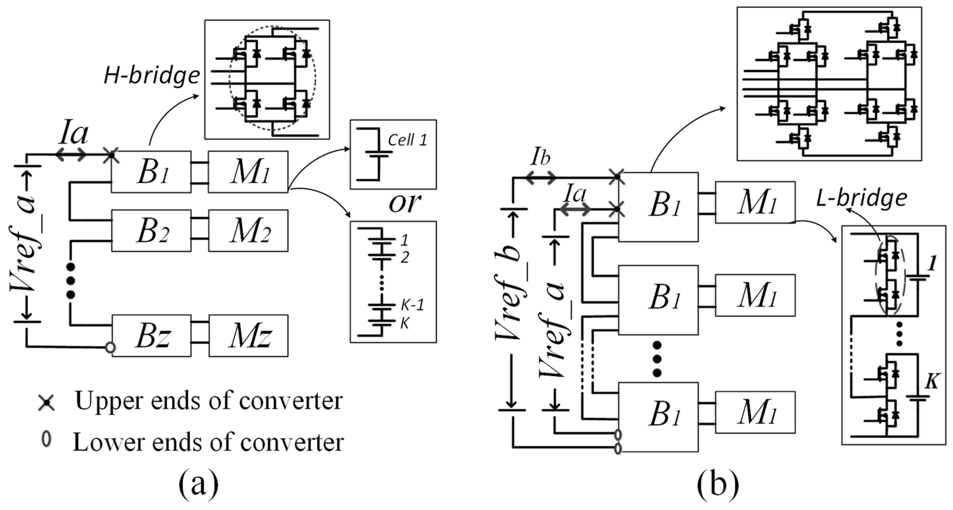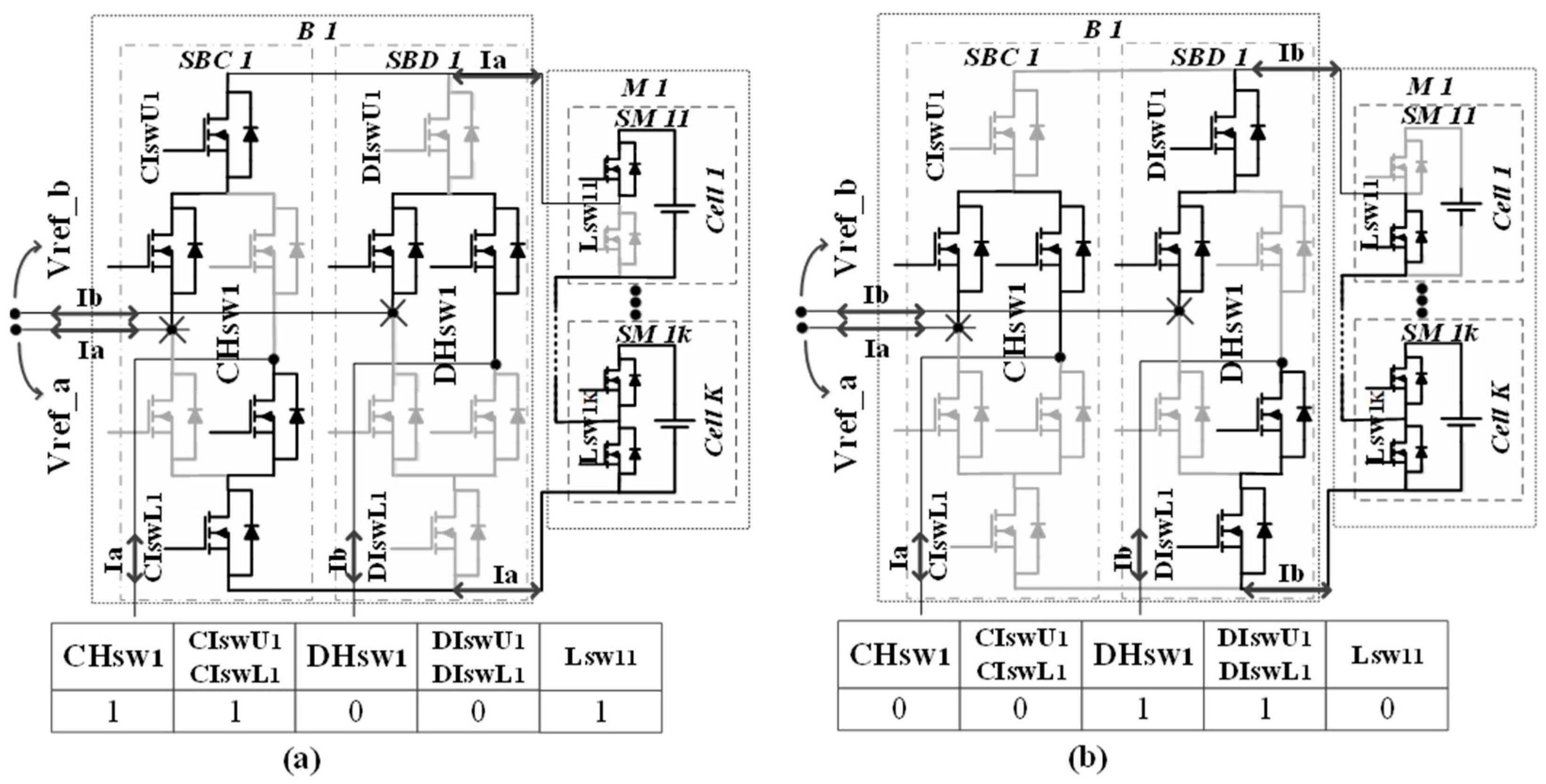 In Figure 4, before the start of the DCHMMC operation, M1 is directly connected to Vref_a and Vref_b through SBC1 and SBD1. However, M1 is isolated from Vref_b once it is activated to be in Vref_a (Figure 4a), and vice versa (Figure 4b). Note that during the same Ts, SBC and SBD of the same B (i.e., SBC1 and SBD1 of B1) cannot be activated together; however, both can be deactivated in order not to use the corresponding M (i.e., M1). In addition, the number of utilised cells in each M is dependent on its L-bridges switches’ statuses, as illustrated in Figure 4a,b. The switching statuses are either ON (1 or −1) or OFF (0). In Figure 4a, the L-bridge/SM (Lsw11) of cell 1 is ON (i.e., cell 1 is utilised), while it is OFF in Figure 4b (i.e., cell 1 is not utilised). As a result, the DCHMMC shows complete control of the number of utilised cells or Ms. It is worth noting that in Figure 4a, the current a (Ia) can access the cells in M1, while the current b (Ib) can only pass through the H-bridge of SBD1 without accessing the cells in M1 to continue its cycle/loop. In comparison, the opposite occurs in Figure 4b (i.e., Ib can only access the cells in M1).