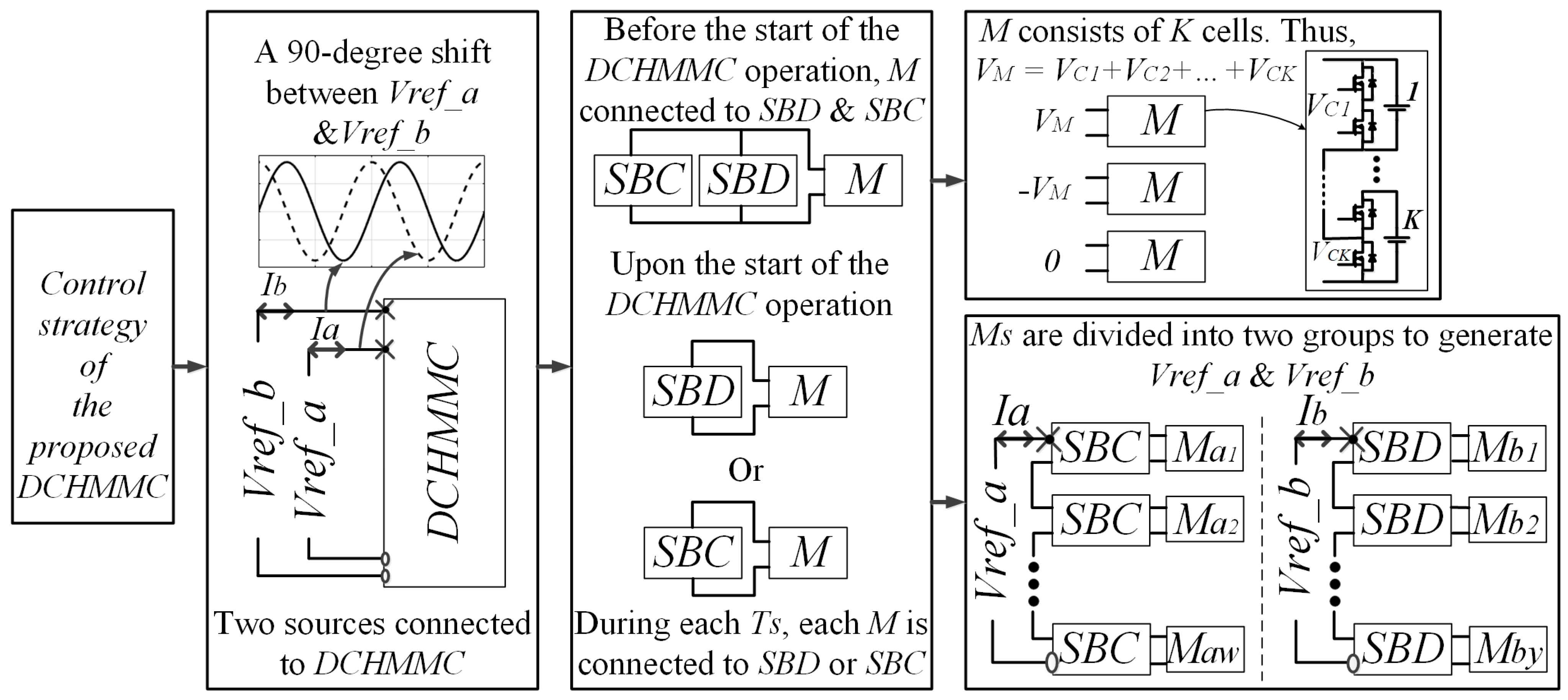 Figure 2 provides an overview of the complete system operation, linking all key processes that are illustrated in detail throughout the methodology section, as well as the control strategy presented at the beginning of the Results Section. It begins with the generation of two reference voltages phase-shifted by 90 degrees (dual sources), followed by their integration into the proposed DCHMMC structure (Figure 3). The diagram then outlines the converter operation before and during switching, where each M connects to either SBC or SBD during each Ts (Figure 4). Subsequently, the output voltage across each M is determined (Figure 5), leading to the distribution of Ms into two groups responsible for generating Vref_a and Vref_b (Figure 6). Figure 7 shows the generation of two reference voltages phase-shifted by 90 degrees. All these processes are governed by the control strategy presented in Figure 8, ensuring coordinated operation of the proposed converter.