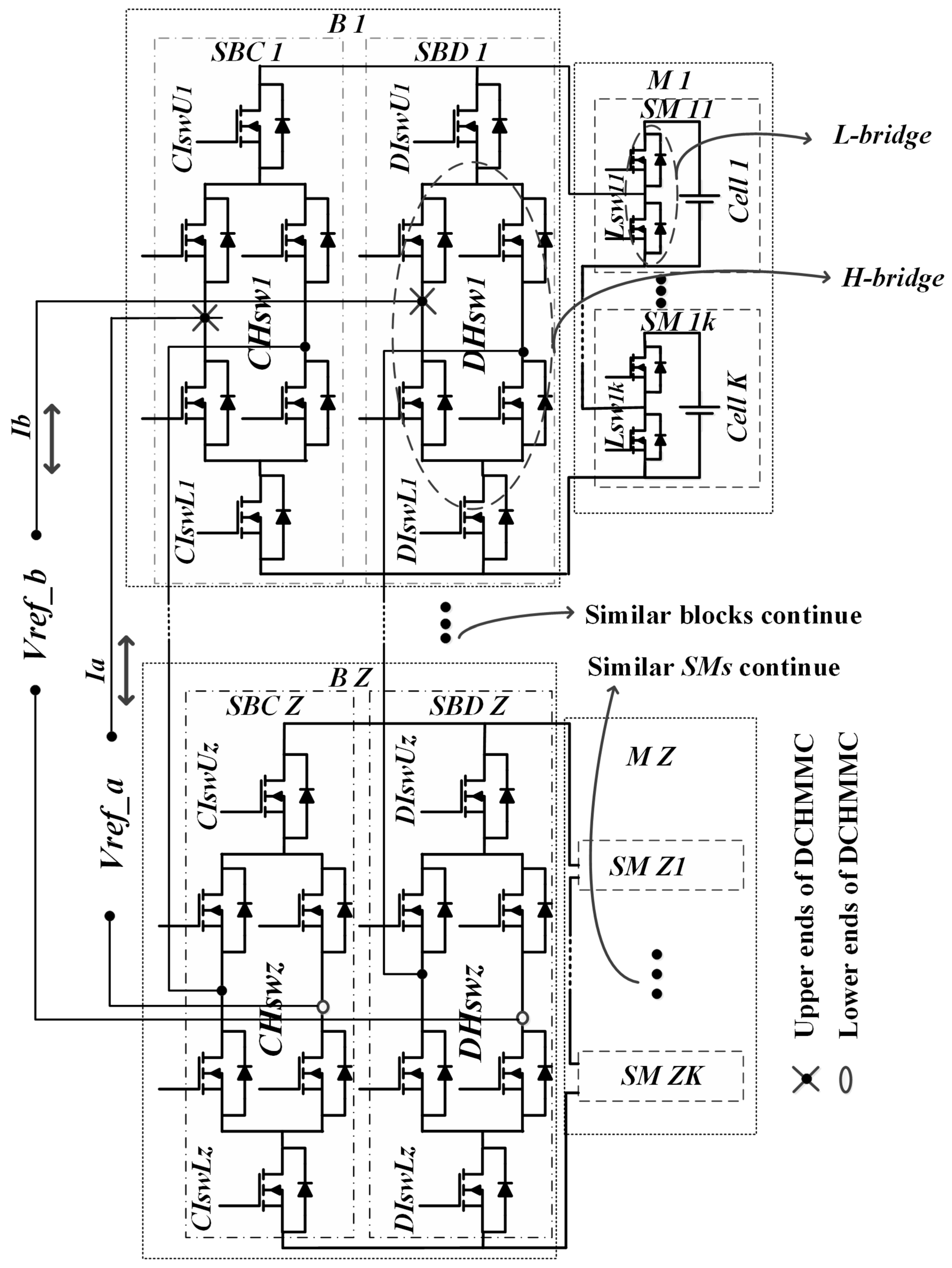 Figure 3 presents the proposed converter for serially connected Li-ion cells in the battery pack for EV applications. It consists of blocks (Bs), sub-blocks (SBs), modules (Ms), and sub-modules (SMs), which are integrated in series and parallel to create the whole proposed converter. Each SM consists of integrating an individual cell into the L-bridge MOSFET switches. Each specific number of SMs is integrated in series, forming what is called the M. The M is integrated in parallel into the B. Since the M has two ports, the upper part of the M is integrated into the upper part of the B (the upper terminal of the SB), while the lower part of the M is integrated into the lower part of the B (the lower terminal of the SB). The B consists of two typical SBs integrated in parallel, forming what are called sub-block charging (SBC) and sub-block discharging (SBD) (the C and D letters at the end of SBC and SBD refer to the charging and discharging processes, respectively). SBC and SBD are integrated into the next SBC and SBD, which are included in the next M, consisting of what will be called a dual cascaded hybrid modular multilevel converter (DCHMMC). The end of each DCHMMC can be connected to a source (i.e., Vref_a and Vref_b), as will be explained in the next Sub-Section. In other words, DCHMMC can be integrated with a dual-source system that operates simultaneously.