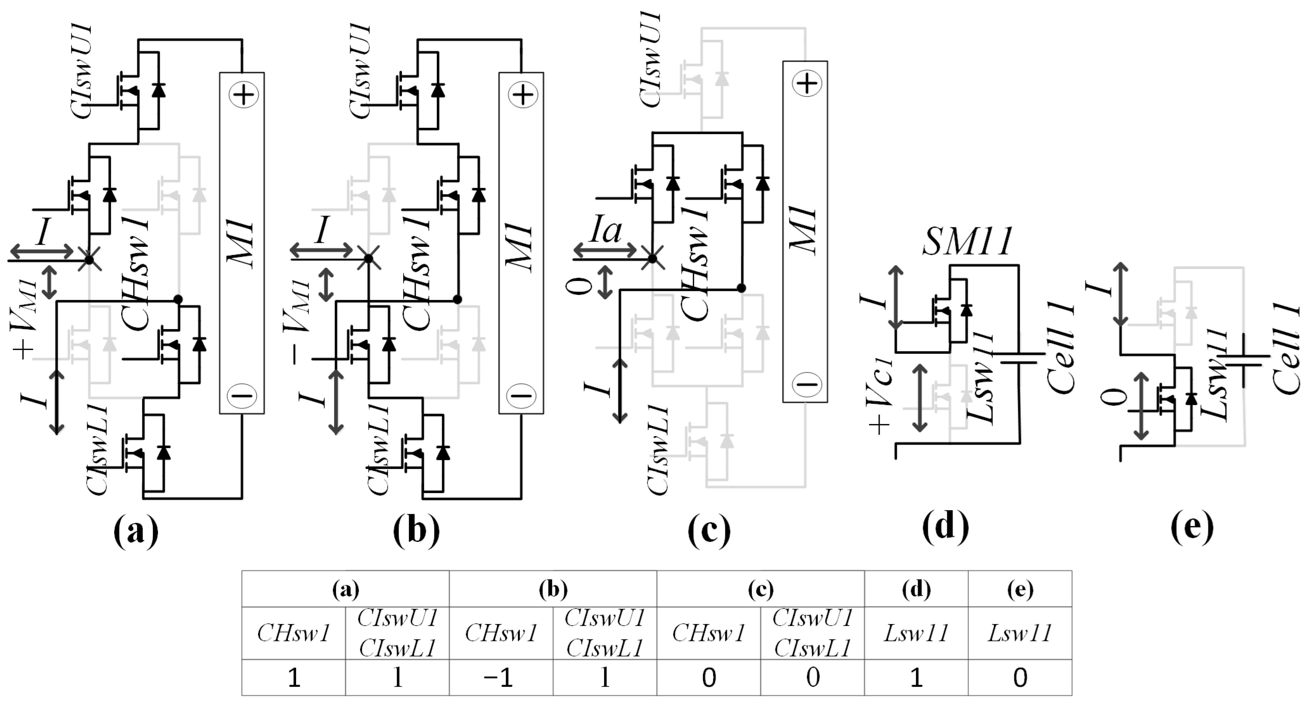 Figure 5. Effect of M1-related switch statuses on the output voltages of M1 and SM11. The output voltage of M1 is (a) +VM1, (b) −VM1, and (c) 0 when CHsw1 is set to 1, −1, and 0, respectively. The output voltage of SM11 is (d) +VC1 and (e) 0 when Lsw11 is set to 1 and 0, respectively.