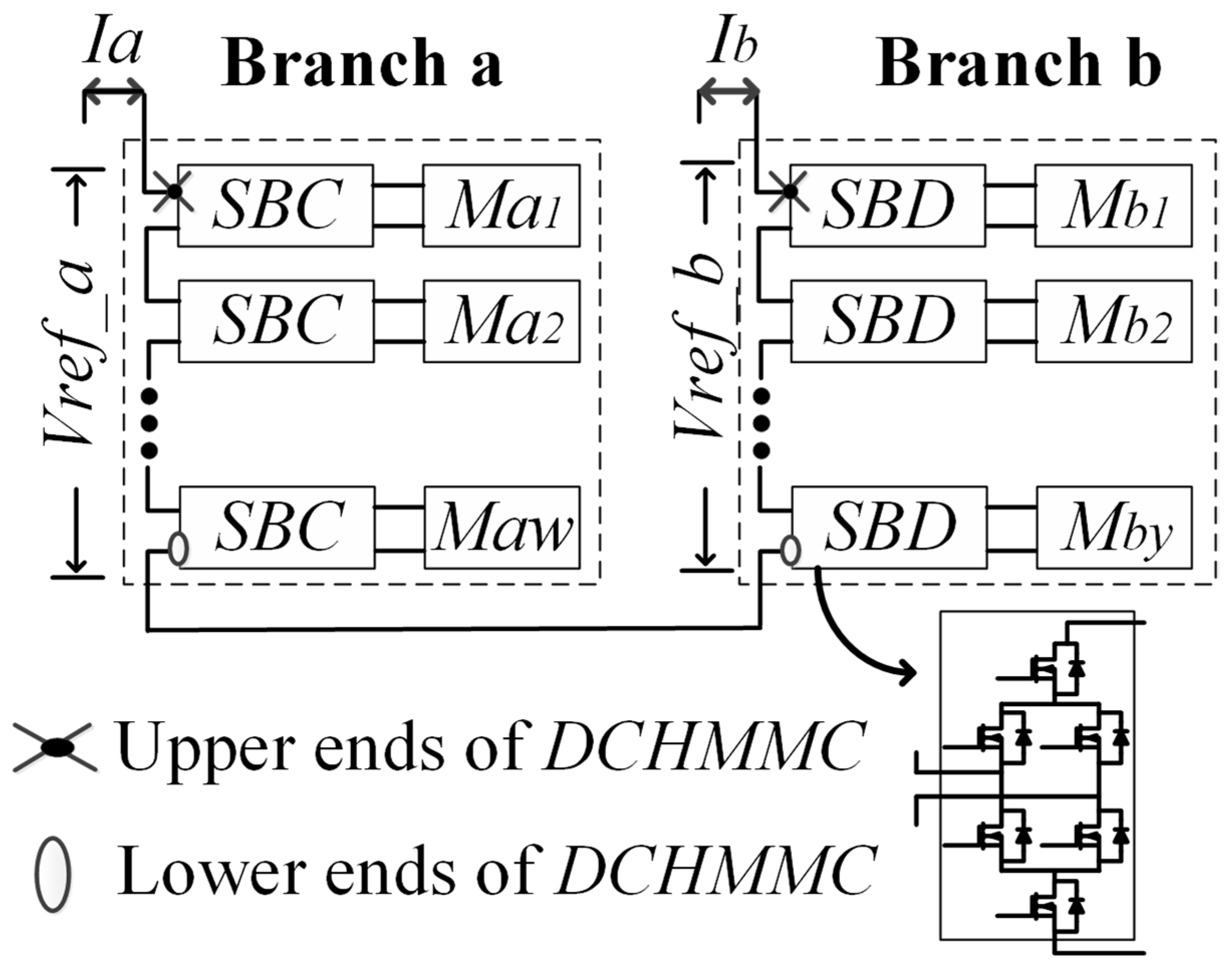 To avoid the overlapping of two-system currents, complete isolation among these two branches must be achieved prior to the utilisation of their corresponding Ms. All the cells/Ms participate in producing each level of Vref_a and Vref_b during each Ts. However, there is no specific cell or M for a particular phase/branch. It is worth noting that during each Ts, each cell/M can only be utilised in a single branch. In Figure 6, each branch consists of a single cascaded hybrid modular multilevel converter (CHMMC). The first branch is from Ma1 to Maw, whereas the second branch is from Mb1 to Mby. These branches are utilised to produce Vref_a and Vref_b, respectively.