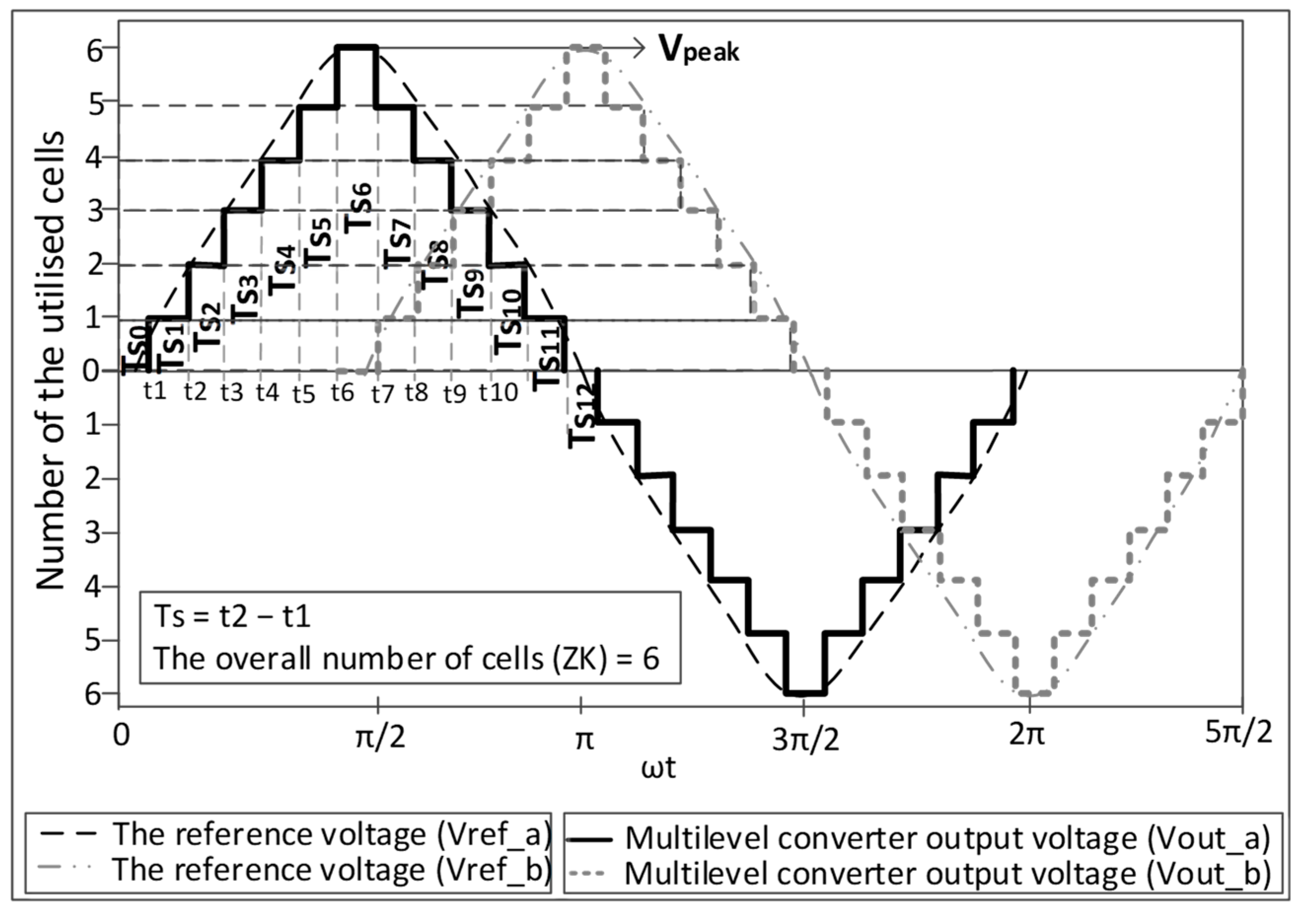 Note that a 90-degree phase shift exists between Vref_a and Vref_b, and thus, the values of Vref_a and Vref_b change synchronously with each other, as shown in Figure 7. Consequently, the number of cells/Ms activated in each branch varies with time according to its corresponding Vref value. The terms w and y are the number of the Ms activated to produce Vref_a and Vref_b, respectively, during each Ts. Accordingly, the summation of w and y must not exceed the total number of Ms (Z). A 90-degree phase shift is chosen to be included between the two phases to maximise the difference in the number of required cells/Ms to generate each phase. For example, during Ts7 in Figure 7 (where the two phases are 90-degree shifted), Vref_a has the highest voltage value (Vpeak), while Vref_b has the lowest voltage value (zero voltage). Additionally, at Ts8, Vref_a begins to decrease while Vref_b starts to increase. Thus, at any given time, the overall number of the required cells/Ms (w + y) to produce Vref_a and Vref_b will not exceed the total number of cells/Ms (Z). Table 3 illustrates an example of the number of required cells to produce Vref_a and Vref_b in Figure 7 during a quarter of the duty cycle (Ts7 to Ts15). It is worth noting that during levels 5 and 6 of Figure 7, the voltage increasing/decreasing speed is less than the voltage increasing/decreasing speed during levels 1 to 4 (for example, during Ts9, Vref_a is in level 5 and therefore reduced by one step voltage, while Vref_b is in level 2 and hence increased by two step voltages). Accordingly, one-third of redundant cells/Ms must be included in the system to generate both references smoothly. For example, 6 cells are required to generate the peak voltage of Vref_a. Thus, 8 cells (=6 + 2 (one-third)) are necessary to generate Vref_a and Vref_b simultaneously.