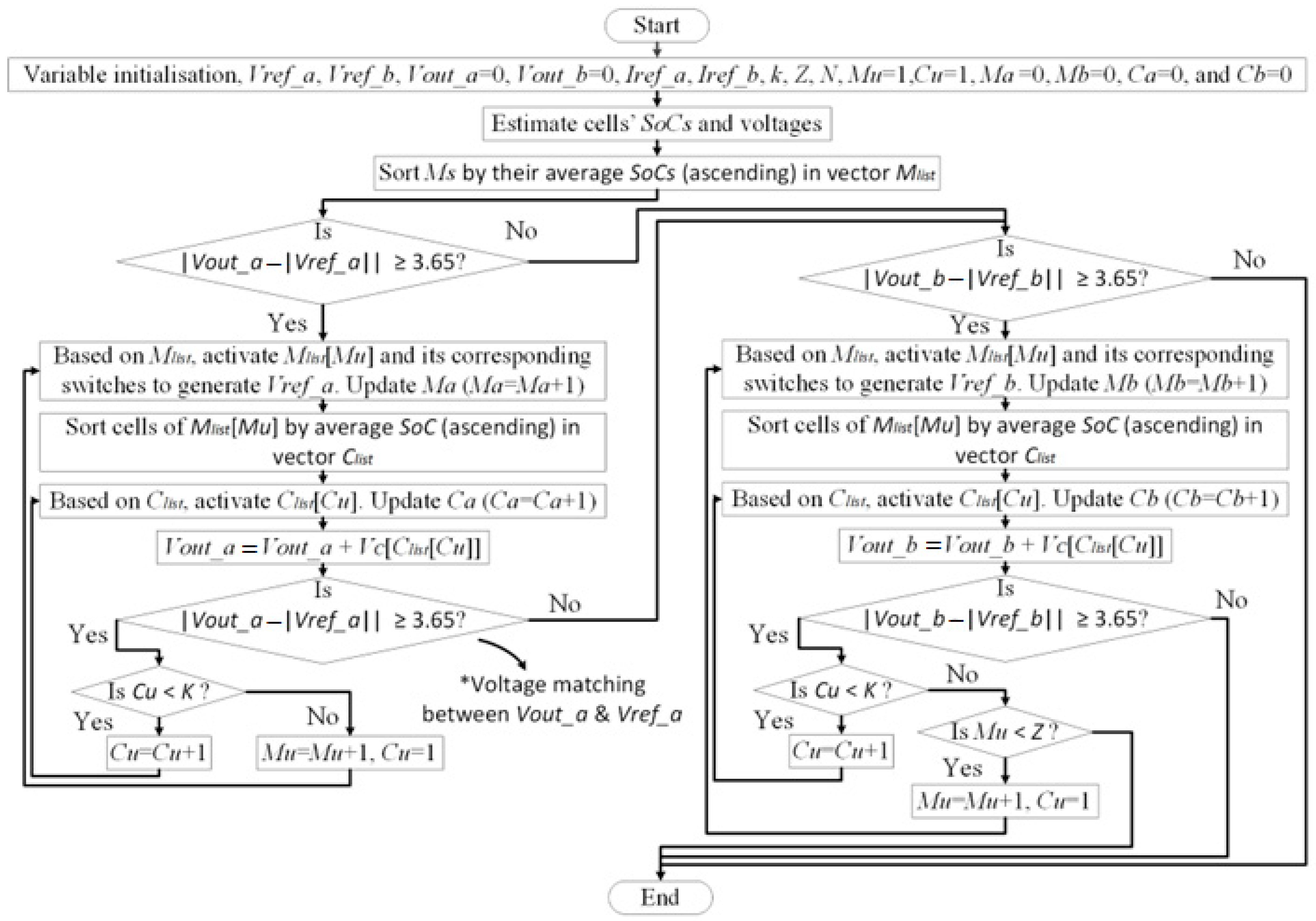 To validate the performance of the proposed converter (see Figure 3), a simulation model was built using the MATLAB Simulink software (R2022b). Table 4 provides a summary of the fundamental parameters of the simulation model. The simulation model parameters are designed to be as closely aligned as possible with the real system. The algorithm of the control strategy used in the simulation model is presented in Figure 8. The numbers of cells utilised to generate Vref_a and Vref_b are denoted as Ca and Cb, respectively, while the numbers of Ms utilised to generate Vref_a and Vref_b are represented by Ma and Mb, respectively. The remaining Ms are therefore Z-Ma-Mb, and the remaining cells are N-ZK. The simulation model employs a basic Li-ion cell configuration, where each cell comprises an internal voltage source (Vint) and an internal resistance (Rint) [33]. Consequently, the terminal cell voltage (VC) is calculated using Equation (2), exhibiting slight variations during charging and discharging due to the effect of Rint. The SoC of each cell is estimated using the Coulomb counting method, formulated based on Equation (3) [34]. Qmax, SoCo, and I(t) represent the cell’s maximum capacity, initial SoC, and charge/discharge current, respectively.