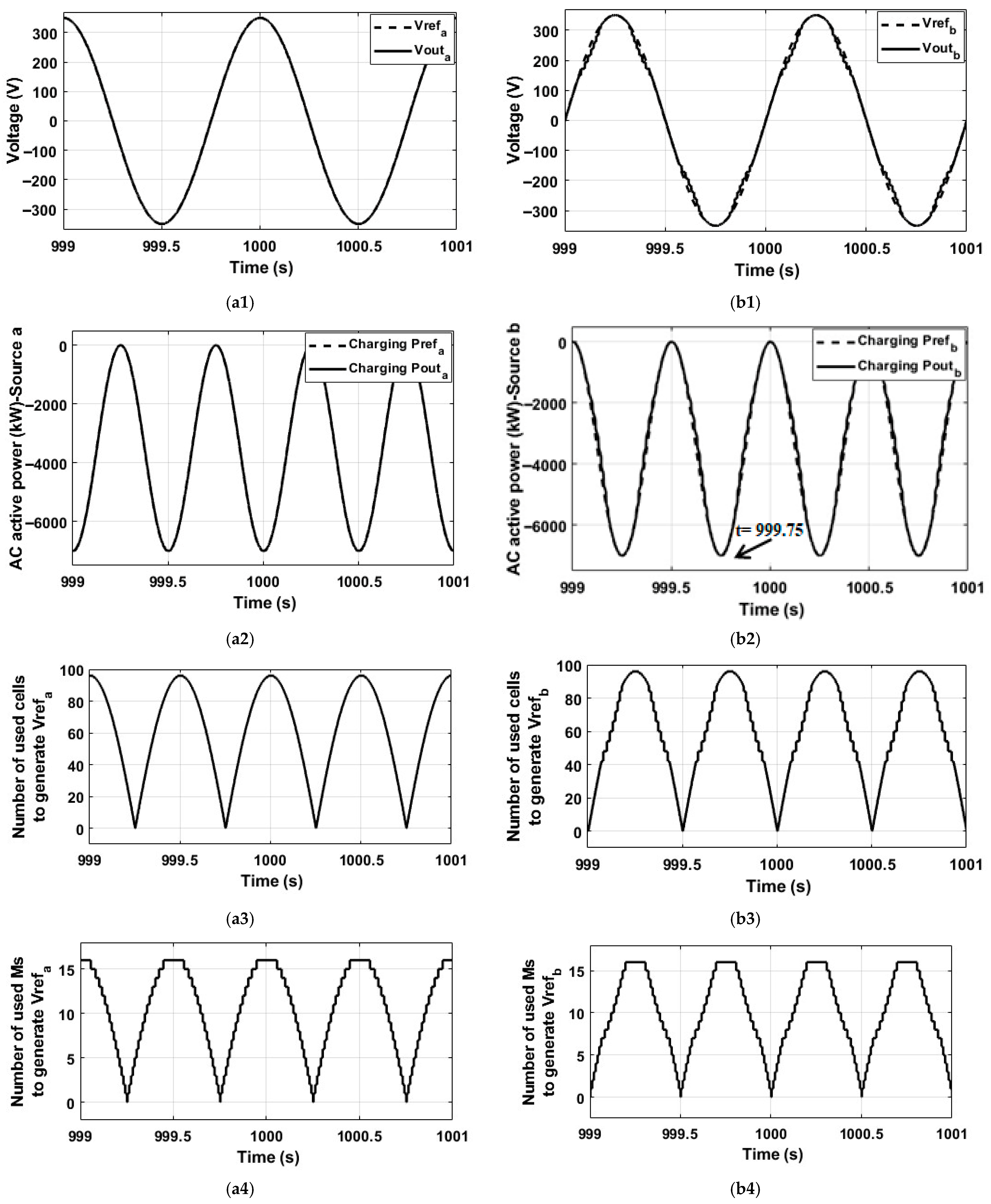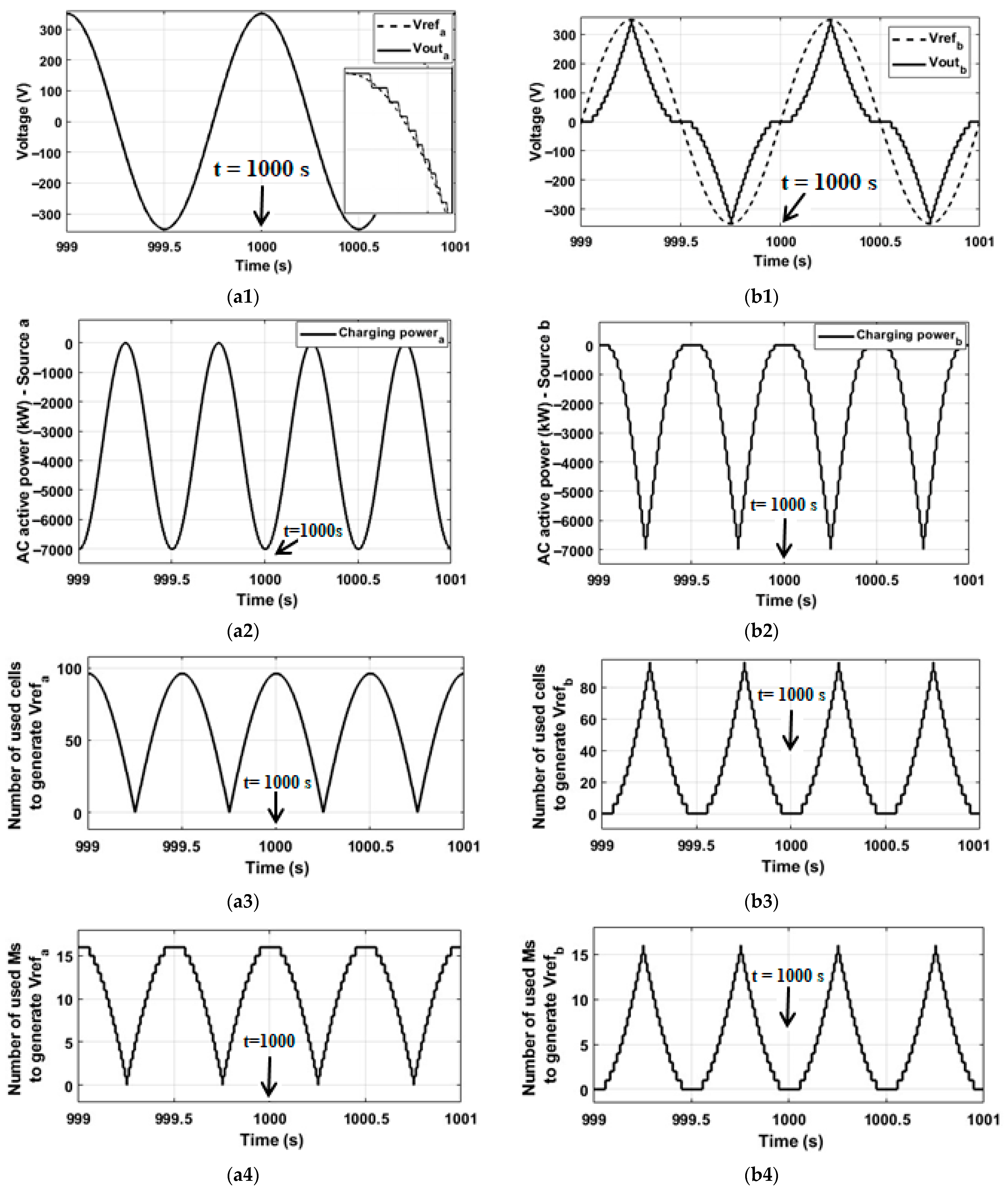 Figure 9 and Figure 10 illustrate the simulation results of the first and second case studies, respectively. Furthermore, Figure 9 and Figure 10 demonstrate the capability of the proposed converter to generate Vout_a (350 V) and Vout_b (350 V), and an AC rated active power (Pout_a and Pout_b), simultaneously, when using 96 cells (16 Ms) and 132 cells (22 Ms), respectively, while highlighting the number of utilised cells/Ms to generate Vref_a and Vref_b during each Ts. In Figure 9(a1), a smooth multilevel sinusoidal Vout_a is generated (Vout_a and Vref_a are identical), while Vout_b is generated with reduced smoothness (Vout_b and Vref_b are not identical), as shown in Figure 9(b1). Accordingly, a smooth AC active power waveform is generated by branch a (Pout_a), as shown in Figure 9(a2), while the generated waveform by branch b to generate Pout_b is distorted, as shown in Figure 9(b2). The negative polarity of Pout refers to a charging operation due to the current (I) and the voltage (V) having different polarities during each Ts, and the power factor is taken as one (ideal case). In Figure 9(a3,a4), the number of cells and Ms is high enough to generate their corresponding reference voltage (Vref_a), while it is not enough to generate another corresponding reference voltage (Vref_b) simultaneously, as shown in Figure 9(b3,b4). However, the peak voltages for both reference voltages are generated. It is noteworthy that at 1000 s, for example, the number of cells/Ms employed to generate Vref_a (Figure 9(a3,a4)) is at its peak and subsequently declines, whereas the number of cells/Ms utilised to generate Vref_b (Figure 9(b3,b4)) is at its lowest and begins to ascend; nevertheless, the rates of increase and decrease are not equivalent. Furthermore, there are no remaining cells/Ms during any Ts. Consequently, redundant cells/Ms must be included in the system, as suggested in case study 2.