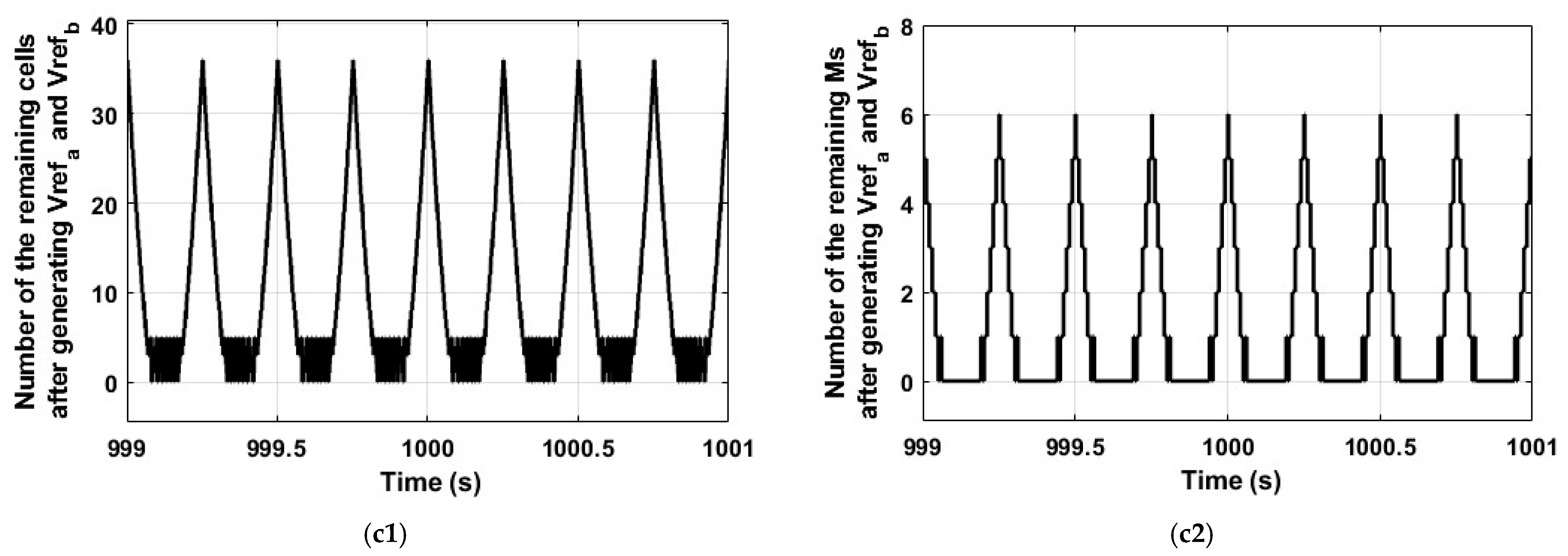 Figure 10(c1,c2) illustrate the number of remaining (idle) cells and M after generating each step of Vref_a and Vref_b, respectively. It can be observed that during any Ts of the system operation, there were remaining/idle cells and Ms. The number of idle cells ranges from 0 to 36, while the number of idle Ms ranges from zero to six. The highest idle number of cells/Ms occurs when either Vref_a or Vref_b is at its peak voltage. It is worth noting that the idle cells/Ms (36 cells/six Ms) are equal to one-third of the redundant cells/Ms that were included in case study 2, compared to case study 1. Consequently, redundant cells/Ms will not be used all the time; however, they are necessary. During some periods, the remaining/idle cells and Ms reach zero, as shown in Figure 10(c1,c2). Consequently, the authors recommend including an additional M in the system to ensure the waveforms are smoother (i.e., the recommended overall number of Ms that should be included in the system is equal to the number of Ms needed to generate the peak voltage of Vref_a × 1.33 + 1).