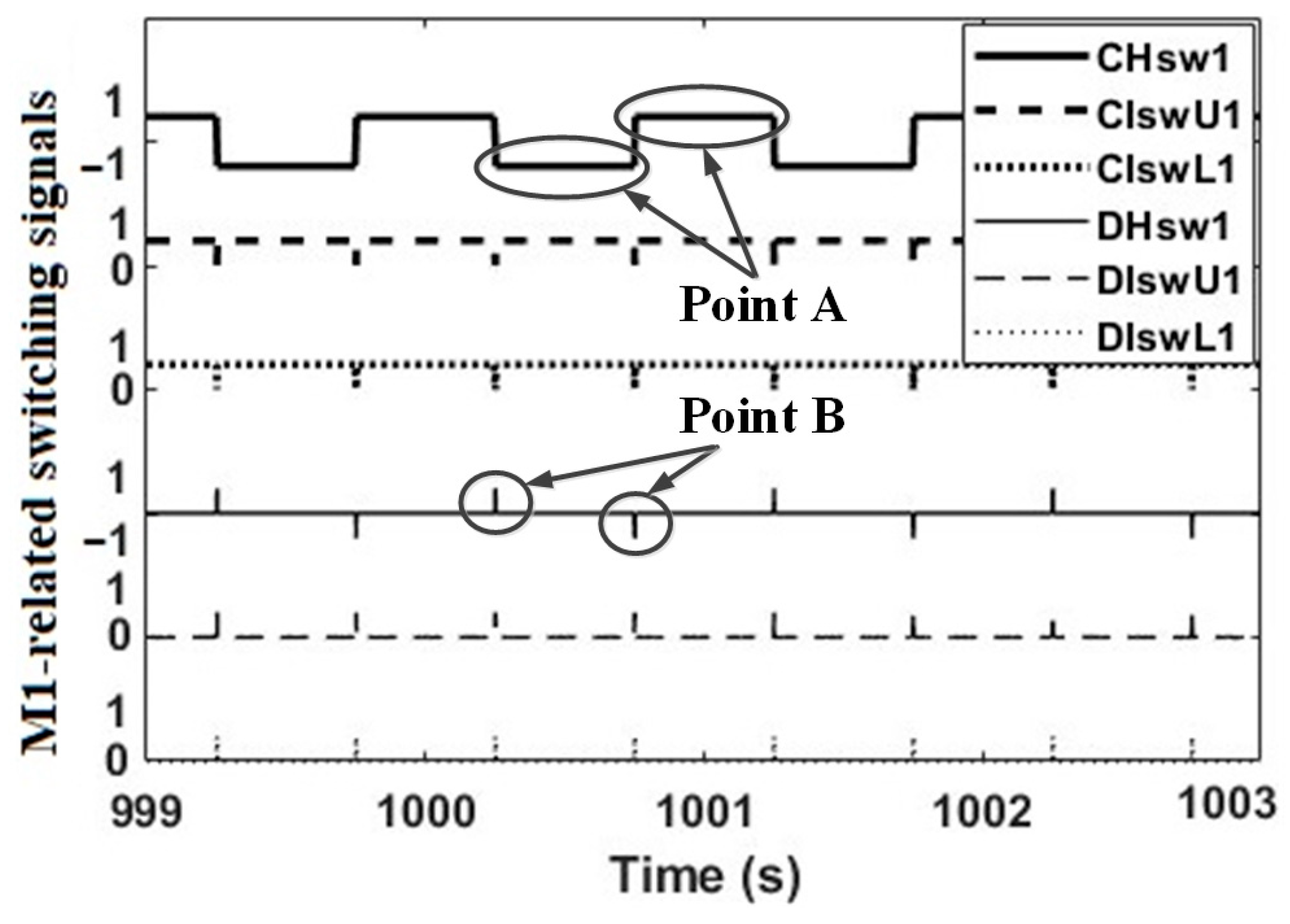 The operating principle of the proposed converter, explained in Section 2.2 and Figure 6, involves distributing cells/Ms into two branches during each Ts of a duty cycle to generate Vref_a and Vref_b, simultaneously. This distribution is obtained by controlling the corresponding switches (CHswz, CIswUz, CIswLz, DHswz, DIswUz, and DIswLz) to operate in either the ON (1 or −1) or OFF (0) status, as detailed in Section 2.2. M1 and its associated switches are chosen to illustrate the distribution principle of Ms, as depicted in Figure 11. In Figure 11, M1 is utilised most of the time to generate Vref_a as shown at point A, where CHsw1 is ON (i.e., 1 or −1 to generate the positive or negative Vref_a, respectively), and CIswU1 and CIswL1 are also ON (1). When M1 is chosen to generate Vref_a, all switches related to Vref_b are OFF: DHsw1 (0), DIswU1 (0), and DIswL1 (0). In contrast, at point B, M1 is activated to generate Vref_b rather than Vref_a, and thus all switches related to Vref_a are OFF: CHsw1 (0), CIswU1 (0) and CIswL1 (0). Additionally, all switches related to Vref_b are ON: DHsw1 (1 or −1), DIswU1 (1), and DIswL1 (1). As a result, the operating principle of the proposed converter was validated, showing that M1 was activated to generate Vref_a during specific time steps and Vref_b during others. In other words, during any given Ts, M1 can be engaged in either Vref_a or Vref_b, but not both simultaneously.