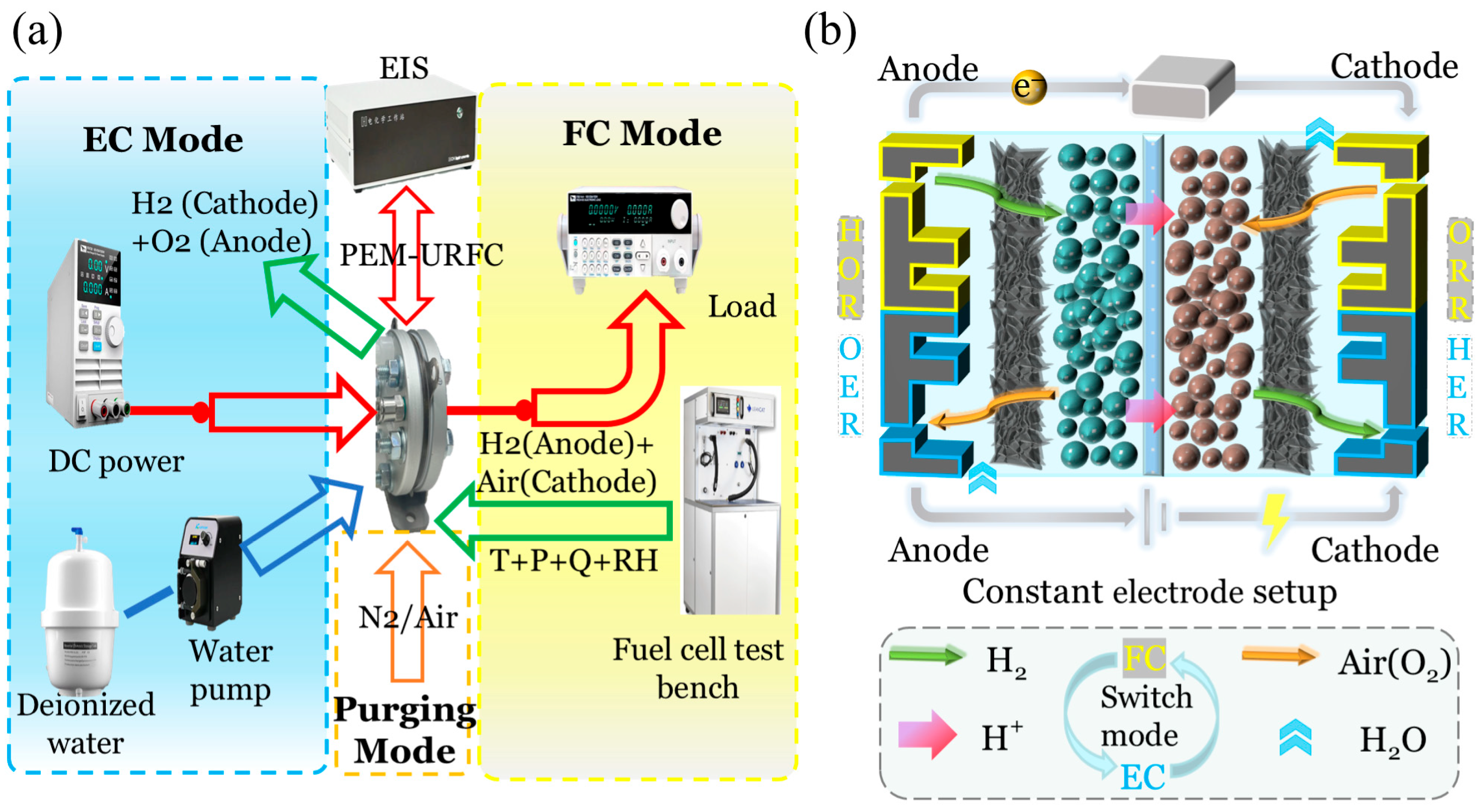 - Hu, Y.; Li, Y.; Ren, P.; Wang, D.; Song, X.; Zhu, Z.; Zhang, L.; Pei, P. Impedance Investigation and Switching Strategy Study of Constant-Electrode Unitized Regenerative Fuel Cell from Electrolytic Cell Through Purging to Fuel Cell. Energy 2024, 32, 137327. [Google Scholar] [CrossRef]