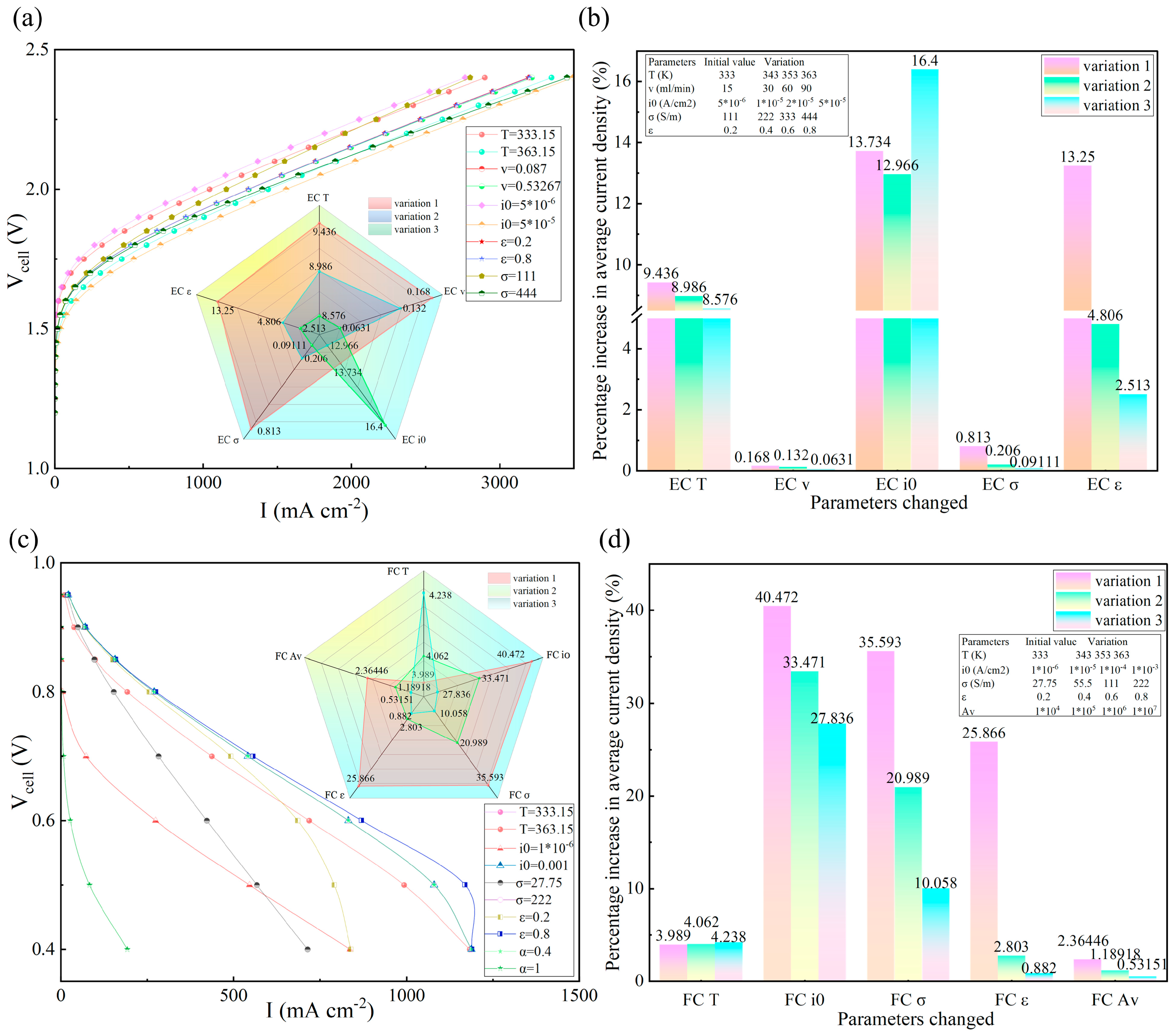 - Sensitivity analysis determines the optimal interval of key structural parameters: the porosity of GDL needs to be >0.4 in FC mode to avoid water flooding, and the conductivity >222 S/m in EC mode inhibits ohmic loss effectively. Breaking the threshold will trigger nonlinear performance degradation (e.g., FC current density gain plummets 25.87–0.88% at porosity > 0.4).