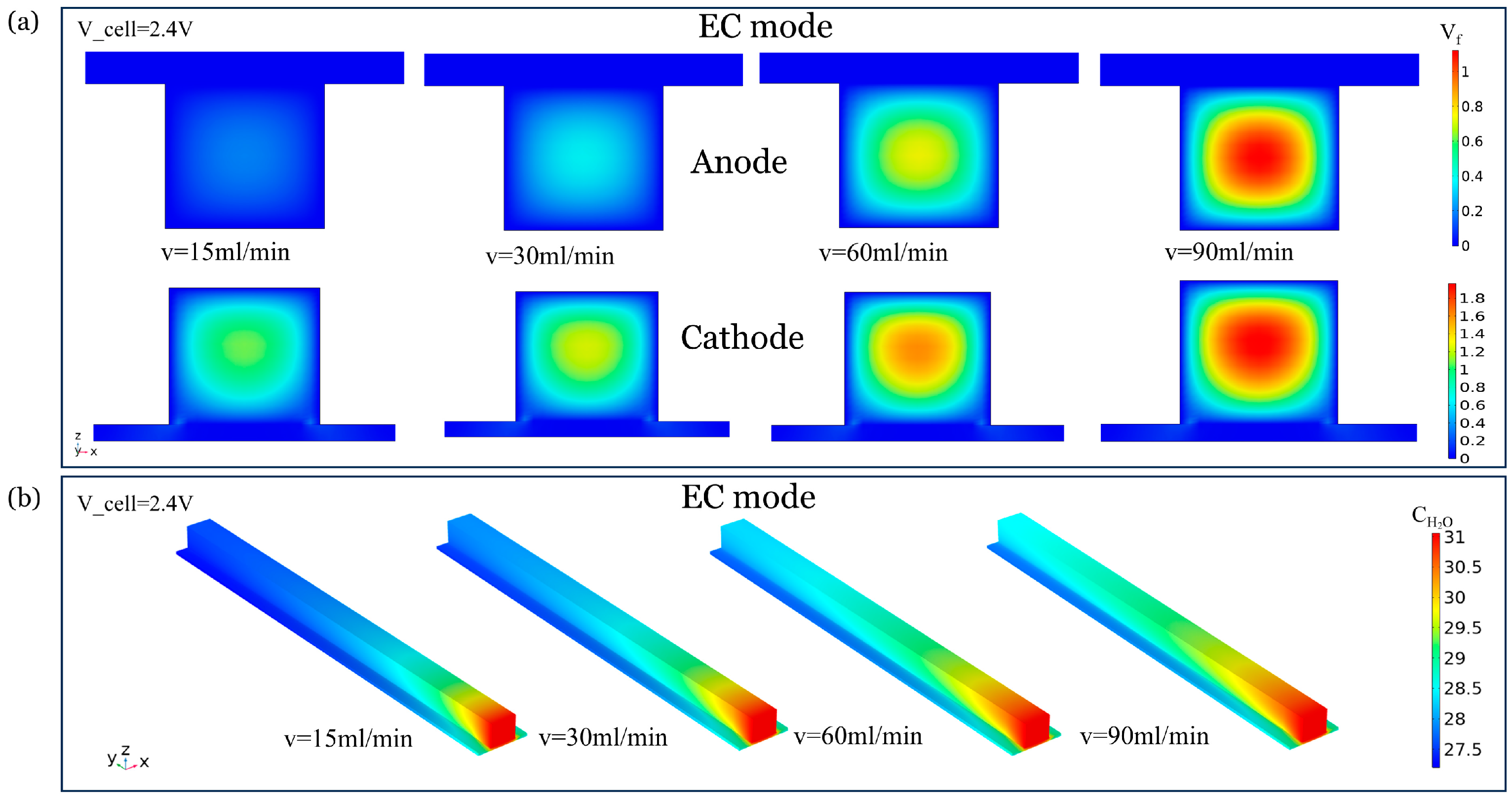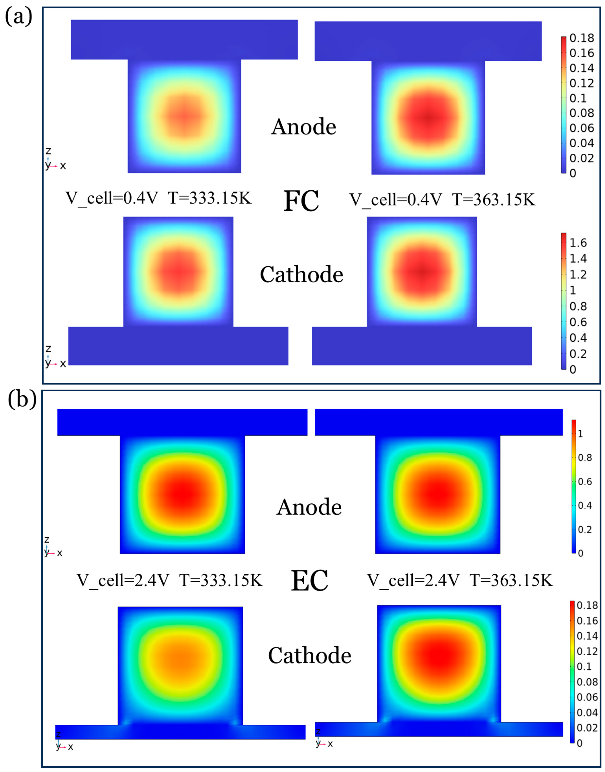 - The spatial distribution analysis reveals that the temperature increase in the FC modes leads to the enrichment of liquid water (>0.8 mol/m3) at the anode exit, while the EC mode inlet forms a low-temperature and high-concentration boundary layer, which emphasizes the strong coupling characteristics of the water-phase equilibrium and the heat–mass transfer in the dual modes.