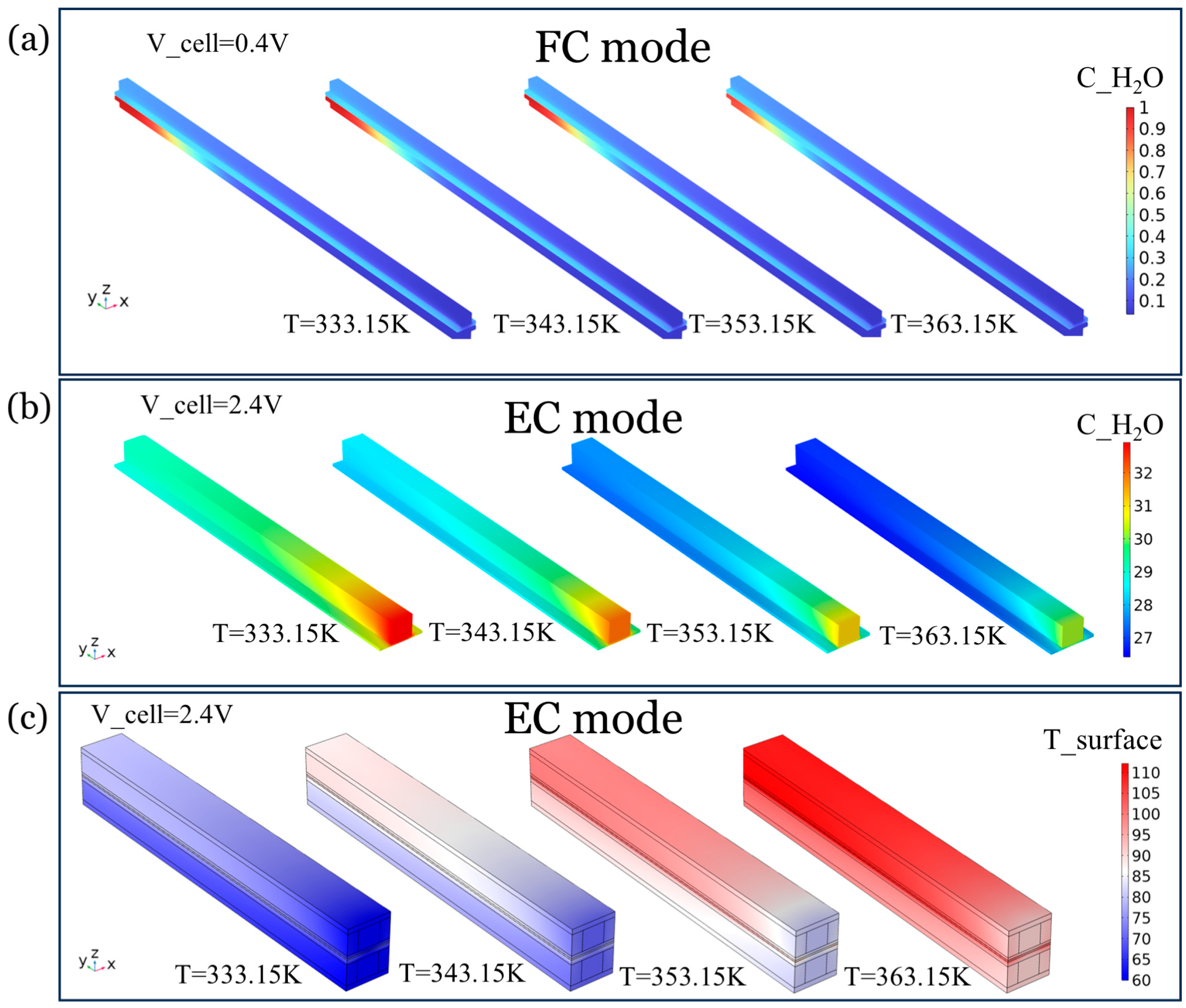 - The parametric contradictions between FC and EC modes were successfully reconciled by a coupled multi-physical field model (COMSOL®), which reveals the mechanisms by different operating conditions and structural parameters on the performance of the dual modes. In particular, both FC and EC modes are sensitive to temperature, exchange current density, and conductivity. Thus, the modeling process is well guided by the parameter determinations.