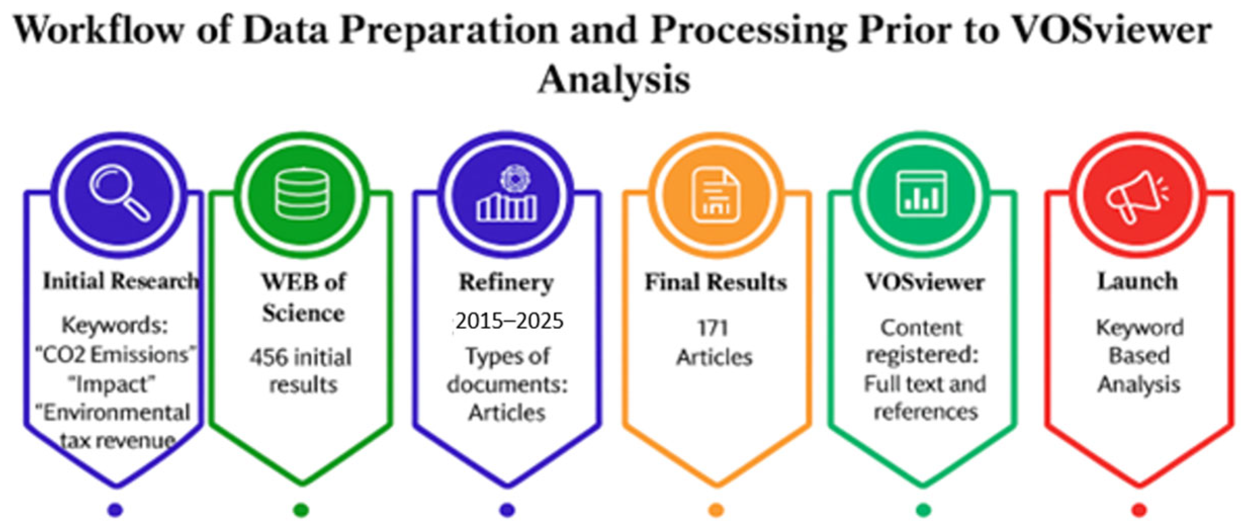 2 Emissions”, “Impact”, and “Environmental tax revenue”. We then selected “Articles” as the document type, yielding an initial result of 546 records. Finally, the analysis period was defined as 2015–2025, as many climate agreements and carbon targets use 2015 as a reference year (e.g., the Paris Agreement, signed in 2015). Selecting the 2015–2025 window helps track progress toward those goals. Therefore, this refinery’s Web of Science results offer 171 entries, which are downloaded as a .txt file, entered into the VOSviewer application, and analysed according to the procedure (