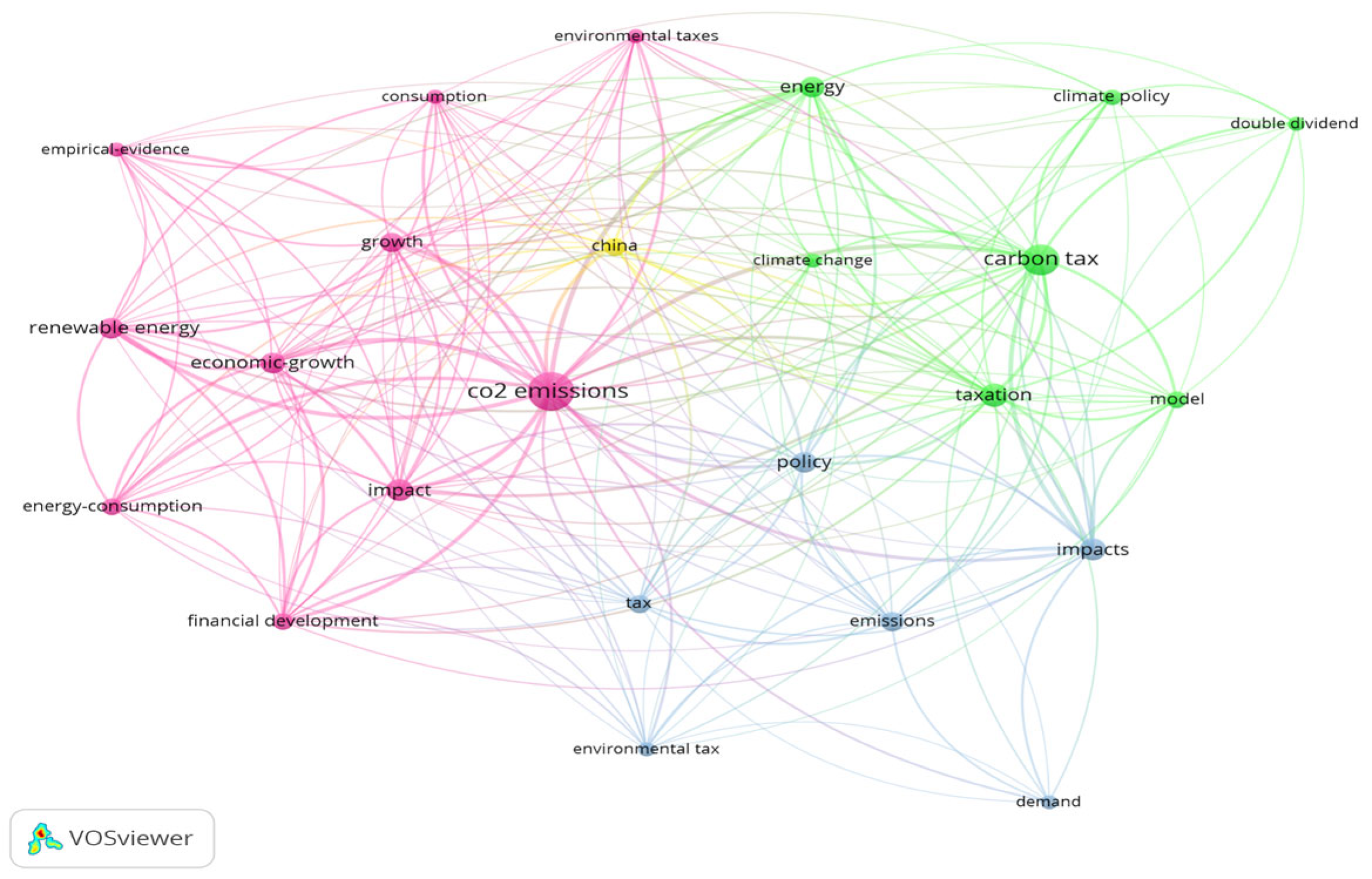 2 emissions”, “financial development”, “renewable energy”, and “growth”, reflecting a strong focus on the environmental and economic impacts of emissions, directly informing (Q1, H1) on fiscal–emissions linkages. The next group by size is the green one. This cluster emphasises the policy-oriented aspects of environmental governance, including terms such as “climate change”, “carbon tax”, “taxation”, and “climate policy”, and highlights regulatory and fiscal measures relevant to (H2) on renewable energy and fiscal instruments. The following blue cluster encompasses keywords such as “impact”, “policy”, or “demand”. These terms represent broader conceptual and analytical perspectives, linking the empirical and theoretical dimensions of environmental taxation and emission effects. The last cluster, represented by the colour yellow, consists of a single keyword, “China.” This indicates a significant geographical focus in the literature, as China is frequently studied as a major emitter and case study in environmental fiscal policy research. The following table,