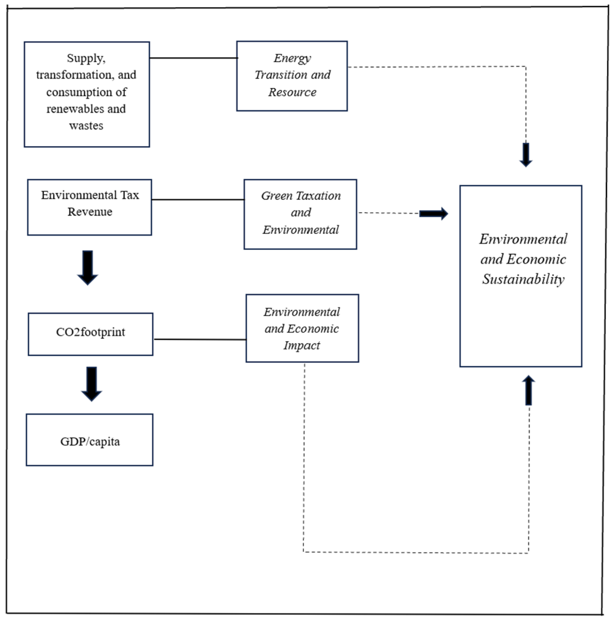 By structuring the dataset around these three pillars, the study not only provides a coherent framework for understanding the interplay among fiscal measures, the energy transition, and environmental outcomes but also lays a strong foundation for applying a multidimensional methodological approach. The dotted lines in the figure generally represent feedback loops, or secondary effects between variables, in contrast to the solid arrows, which show influential relationships.