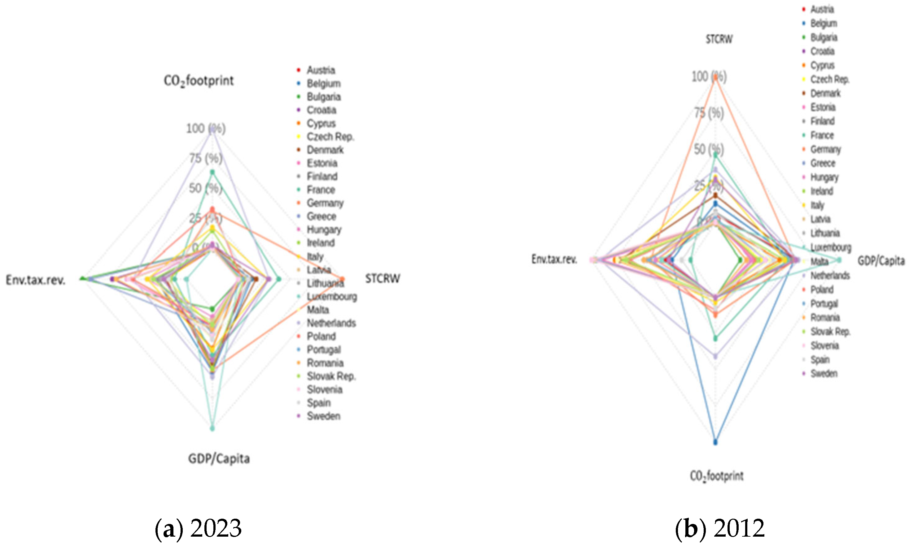 Figure 5, comparing data from 2012 and 2023, unveils a dynamic landscape where country-specific disparities persist, yet their manifestations have evolved across various dimensions. We observe that certain nations consistently exhibit higher GDP per capita values and, regionally, stronger environmental tax revenue. This not only highlights ongoing economic disparities but also reflects the varying maturity levels of environmental fiscal instruments among member states, as presented by Castiglione et al. [